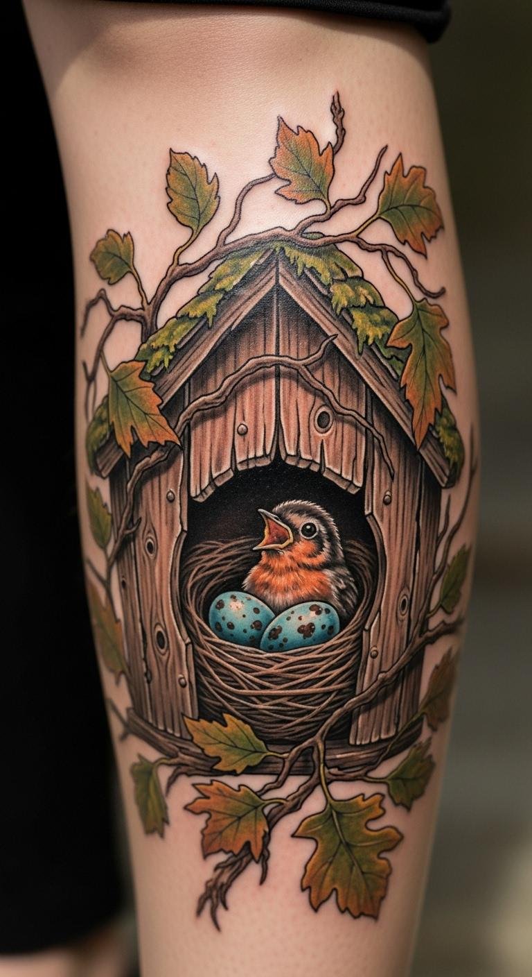 Incorporate leaves into your birdhouse tattoo. Place it on your forearm for visibility. Look at forest photos for ideas. Draw with green markers at home. Opt for natural colors to keep it real. Find artists who specialize in eco-themes. Schedule a short session. This fits nature enthusiasts. Use basic bandages for protection. Practice on skin with a pen. Costs are low for leafy additions.