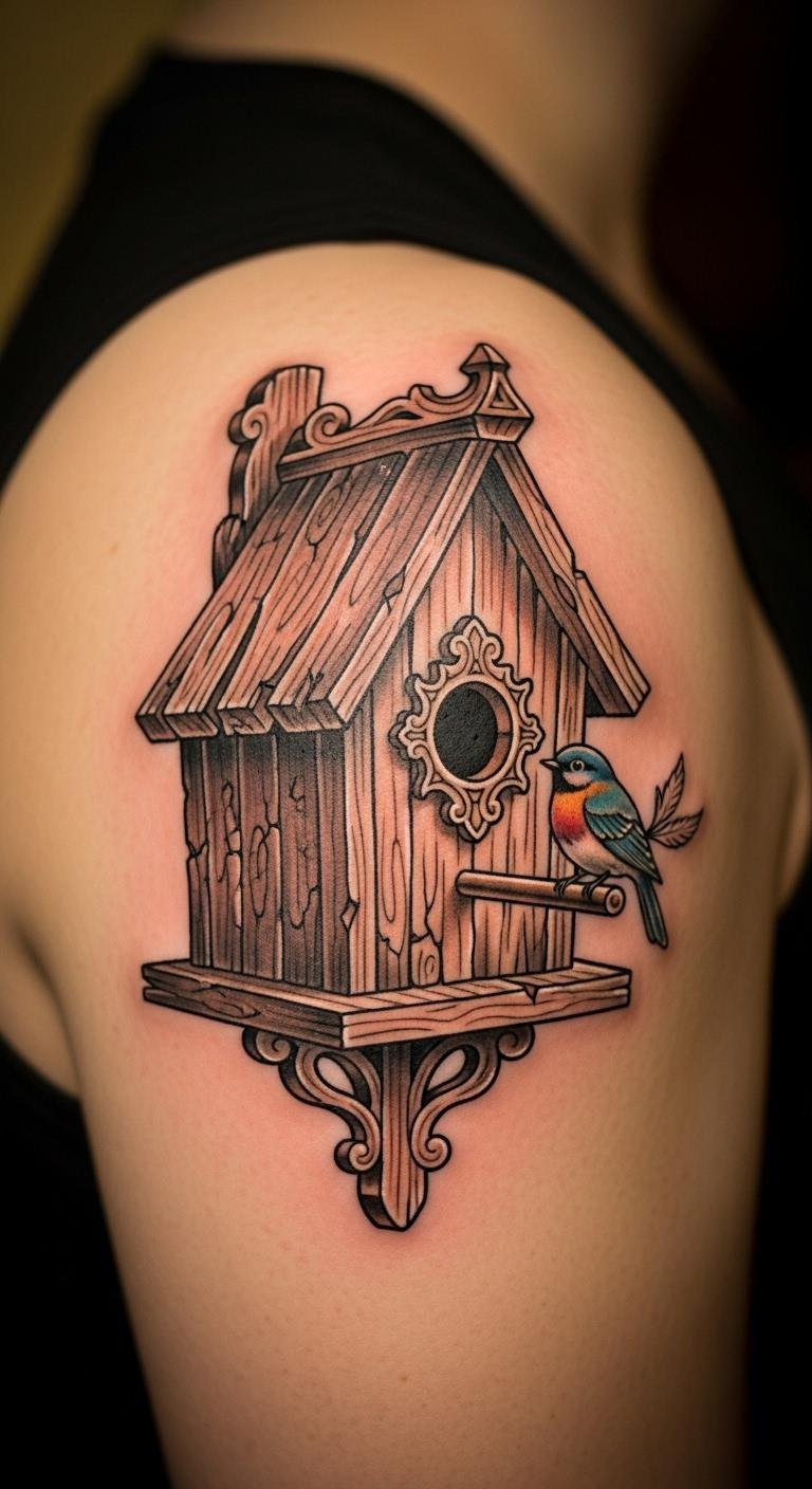 Go vintage with a birdhouse tattoo that looks like an old cabin. Add details like weathered wood lines. Put it on your shoulder for a personal touch. Look at antique pictures for ideas. Grab old magazines to trace patterns. Opt for gray shades to mimic age. Local artists often have budget packages. Plan a quick visit to sketch it out. This design tells a story of history. Use free online templates to refine your concept. Expect a session under two hours. Protect it with clothing at first. Test with a stick-on tattoo. Prices stay low with simple inks.