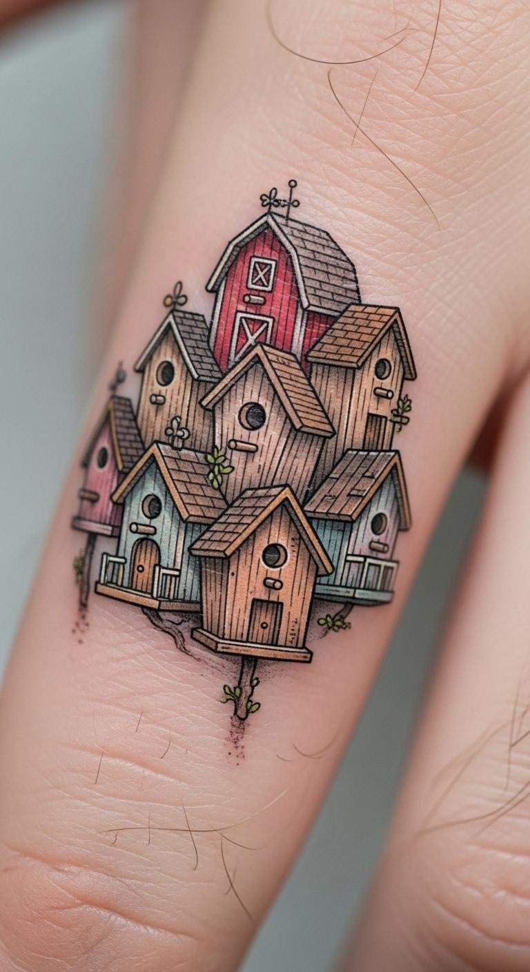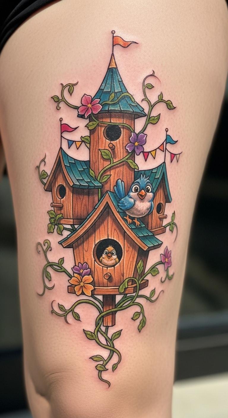 Add color to a birdhouse tattoo for a fun vibe. Imagine flowers wrapping around the house in reds and greens. Place it on your upper arm for some hide-and-show options. Draw inspirations from your garden photos. Use colored pencils at home to mock up designs. Choose water-based inks if you’re on a budget. Find an artist who uses affordable materials. Sessions might take one afternoon. Pair it with nature elements like leaves. This idea works for outdoor lovers. Get quotes from nearby shops to compare prices. Aftercare means moisturizing with basic lotion. Try henna versions before committing. Keep the design small to cut costs.