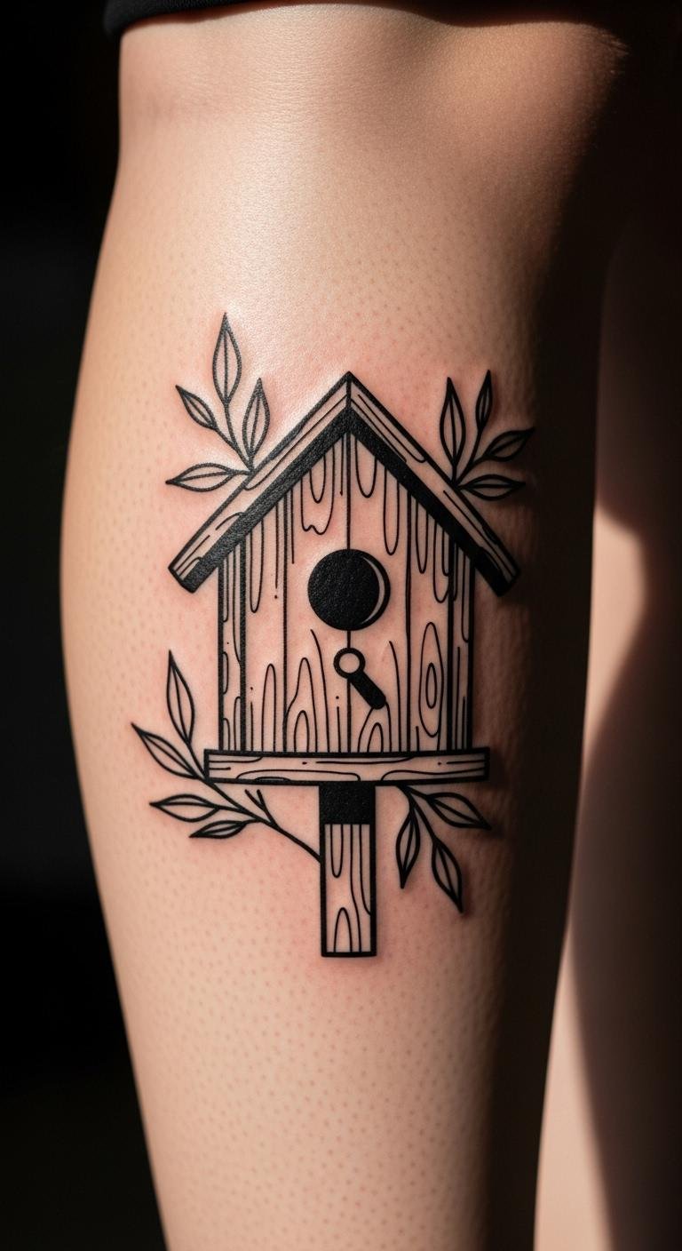 Make it lively with a bird on the birdhouse. Place this on your calf for movement. Keep the bird simple, like a sparrow outline. Snap photos of real birds for reference. Draw on paper with a basic pen. Go for black and gray to keep costs down. Chat with an artist about quick designs. This might fit in one visit. Add branches for extra flair. Share ideas via email to artists. Use affordable creams for healing. Practice with a marker drawing first. Aim for a size that fits your budget.