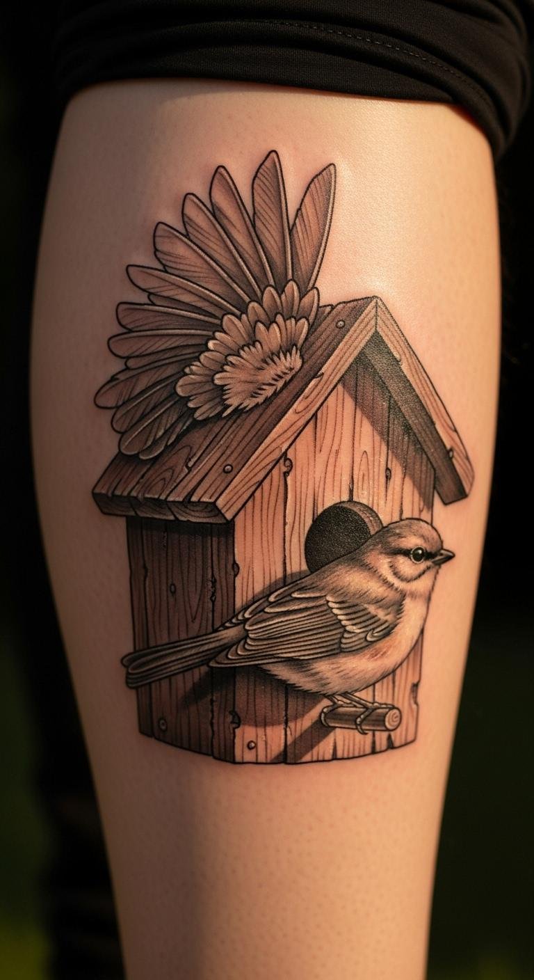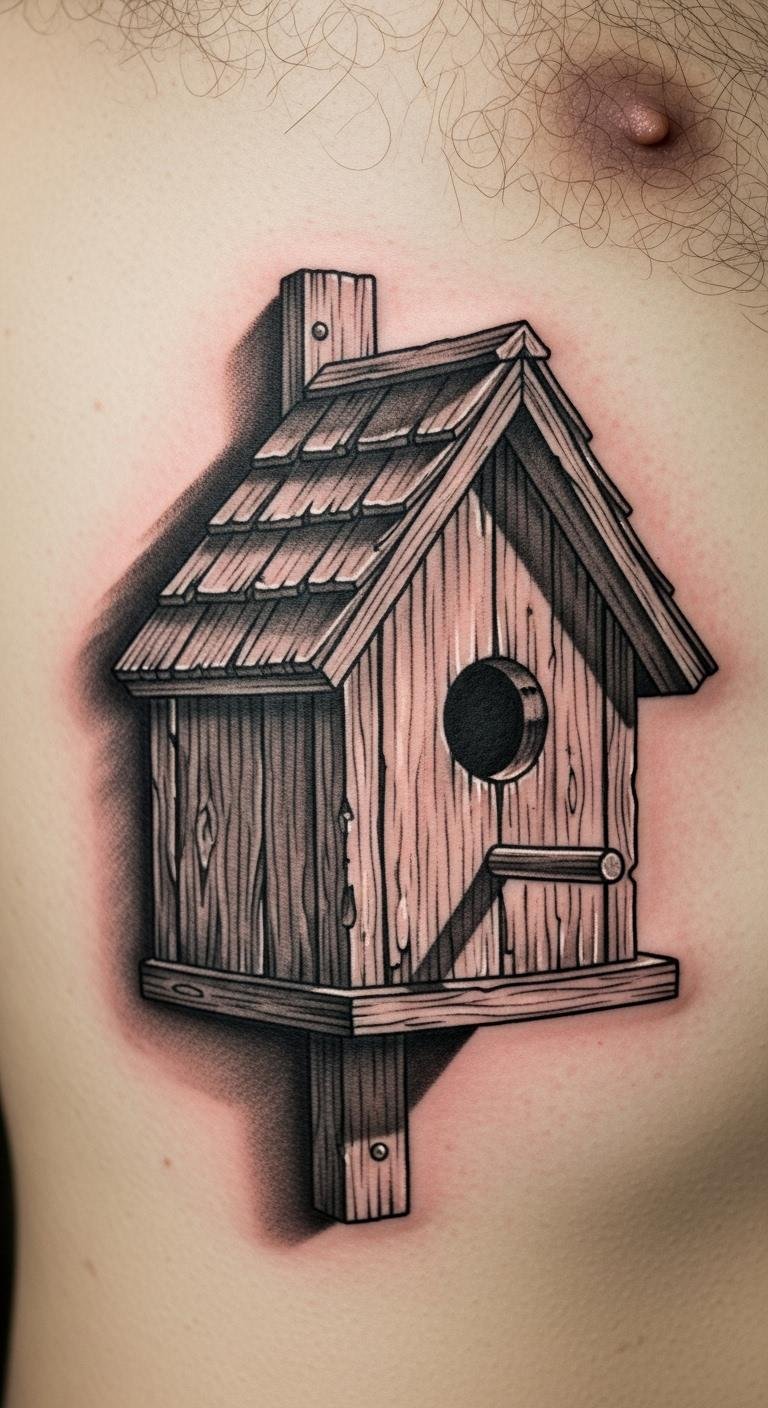 Use shading for depth in your birdhouse tattoo. Place on your rib for a hidden gem. Study light effects online. Shade with pencils at home. Go for gray tones. Local pros handle this well. Plan a focused session. Adds a 3D feel. Protect with clothing. Practice on paper. Value stays reasonable.