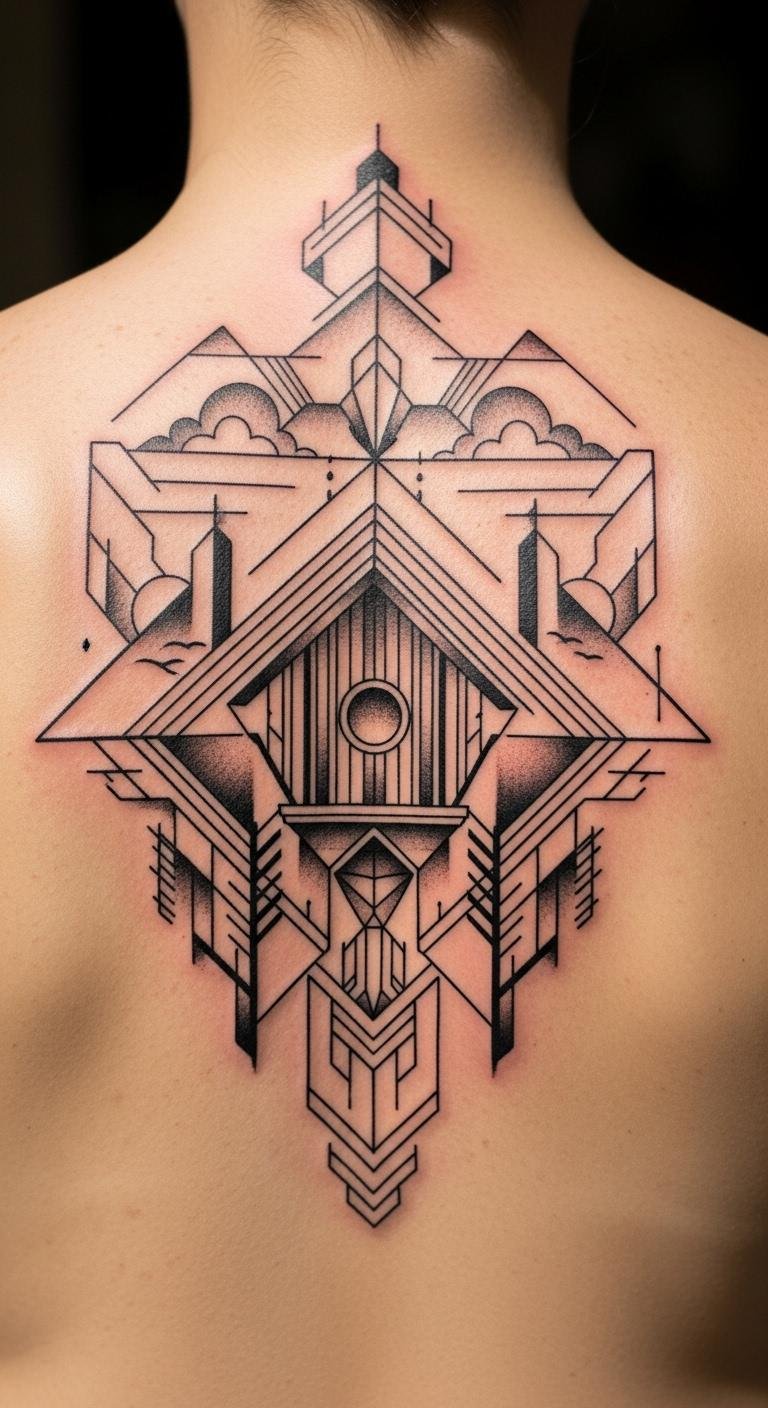 Mix shapes with a geometric birdhouse. Use triangles and squares around the design. Try your back for a larger canvas. Find geometric art online for free. Sketch with a ruler at home. Stick to bold lines for less ink. Artists in town might offer deals. Plan ahead with a simple email. This style suits modern tastes. Keep it symmetrical for balance. After, use gentle soaps for care. Test on paper first. Prices are friendly for basic versions.