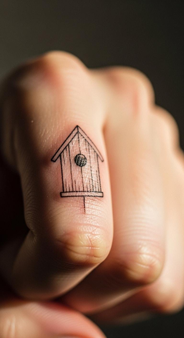 Keep it tiny with a small birdhouse outline. Put it on your finger for subtlety. Use a sharpie to trace first. Search free outline templates. Go with fine lines only. Many artists do this fast. Book for a lunch break. Ideal for discreet fans. Cover with gloves if needed. Test with temporary ink. Prices are very affordable.