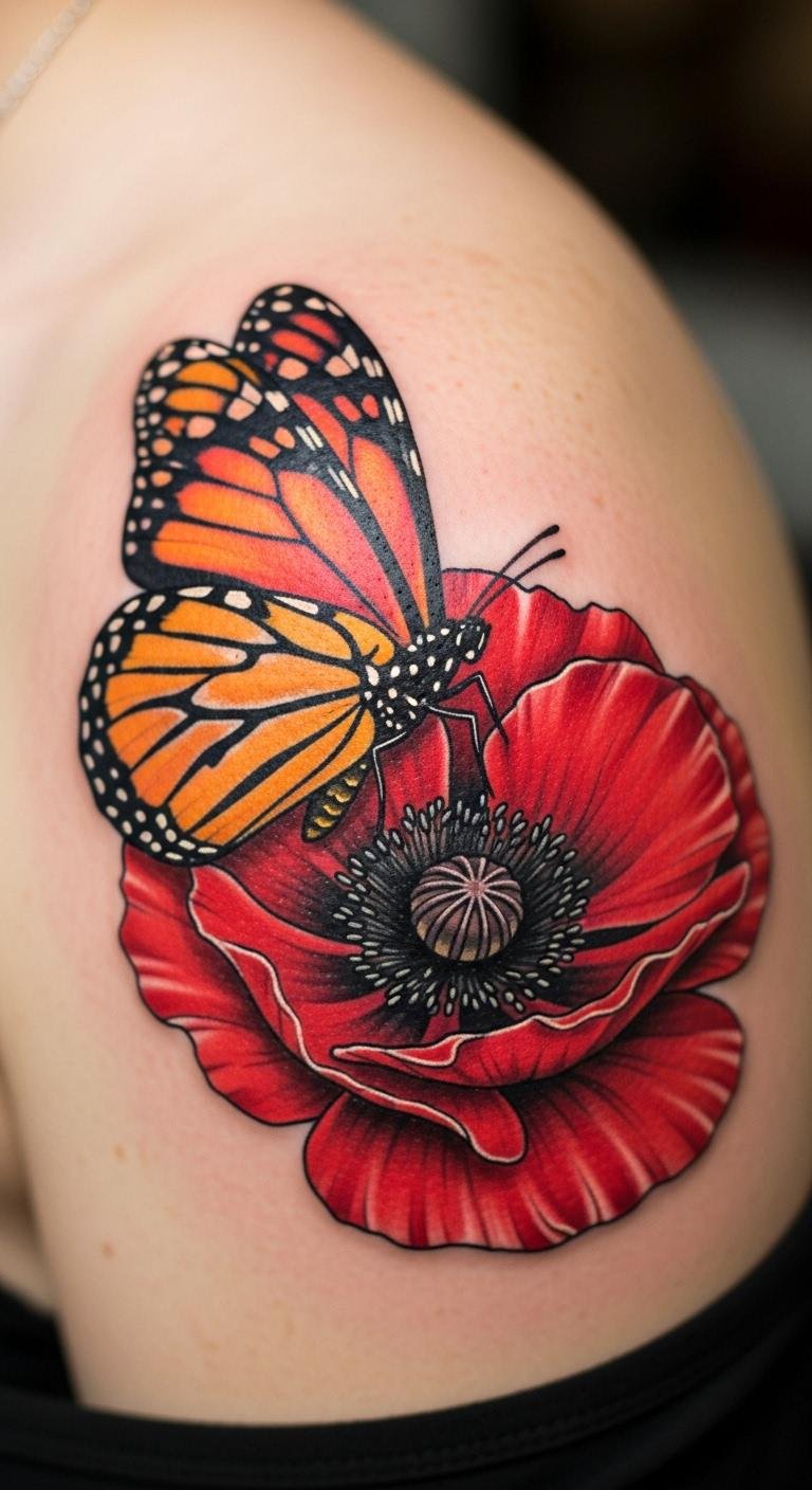 Poppy with butterflies means change. See a pink flower and wings on your shoulder. This combo sparks creativity. Cut shapes from paper at home. Glue them for a mock-up. It costs pennies. Place on your back for art. Artists add extras for $30.