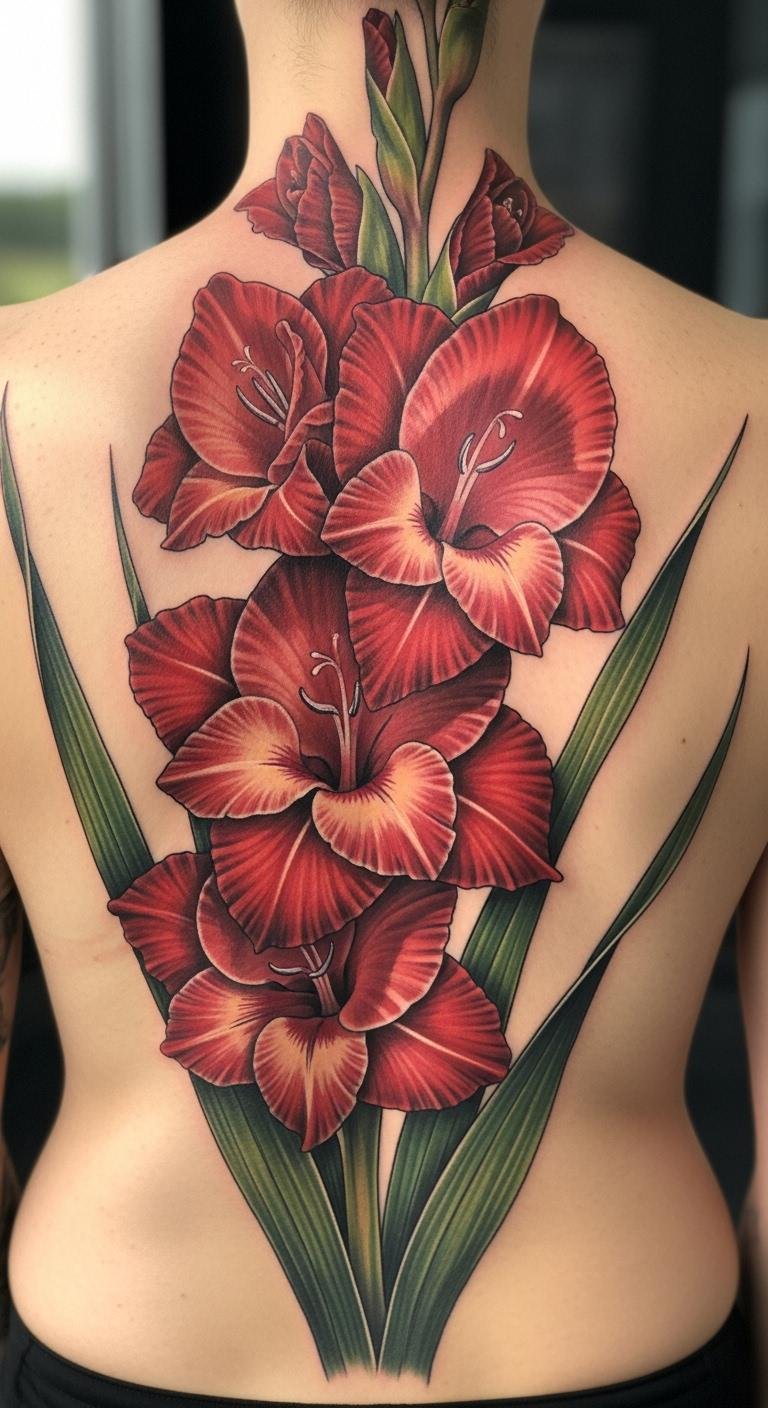 A big gladiolus on your back stands out. Picture wide red petals spanning the area. This one shows endurance clear. Use large paper to plan. Draw with markers you own. Fit it to your frame. Shops handle big ones for $200. Start small if unsure.