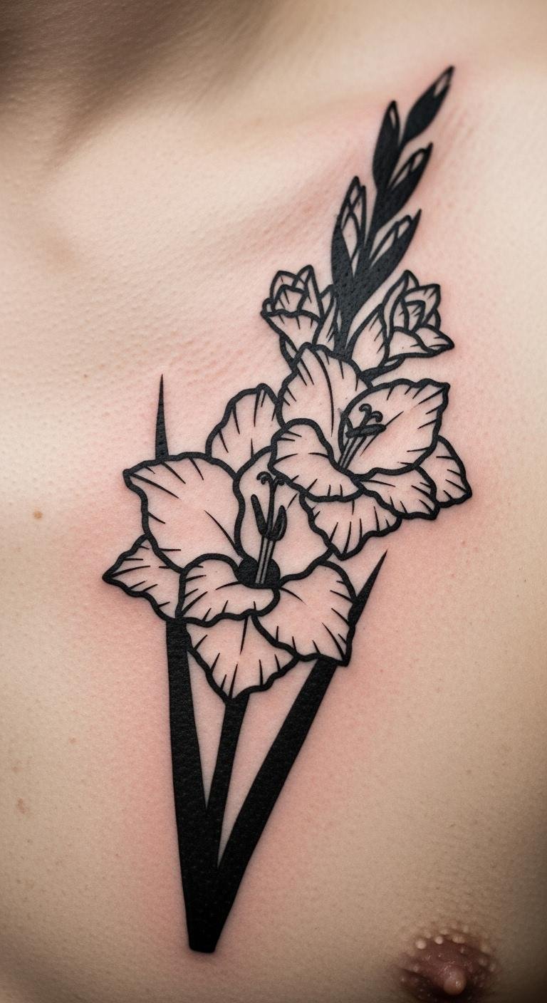 Blackwork gladiolus outlines are sharp. Picture clean lines on your chest. This one keeps it real. Trace with a pen on paper. Freehand your way. Costs are low at $70. Add depth with shading.