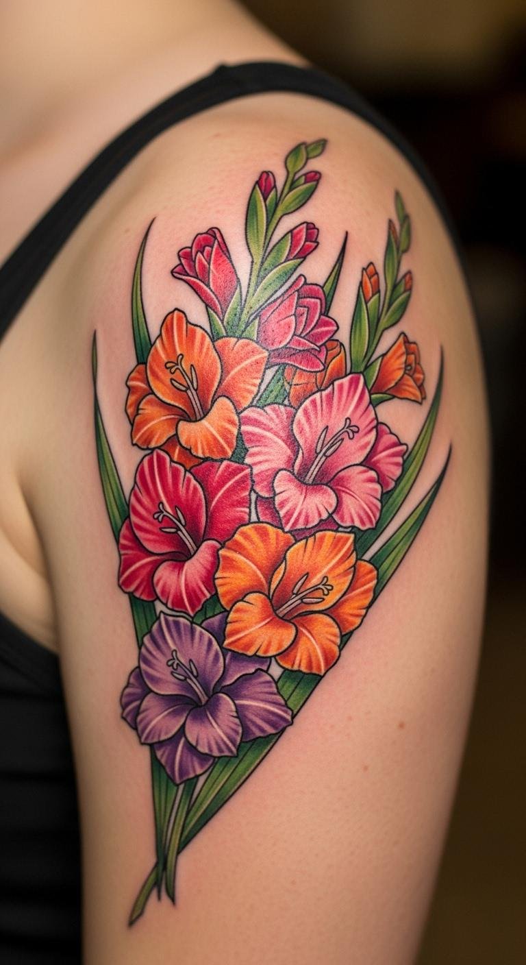A gladiolus cluster on your shoulder packs punch. Envision several blooms together. This design feels full. Arrange fake flowers on your body. Use what you have. It guides placement. Shops create for $100.