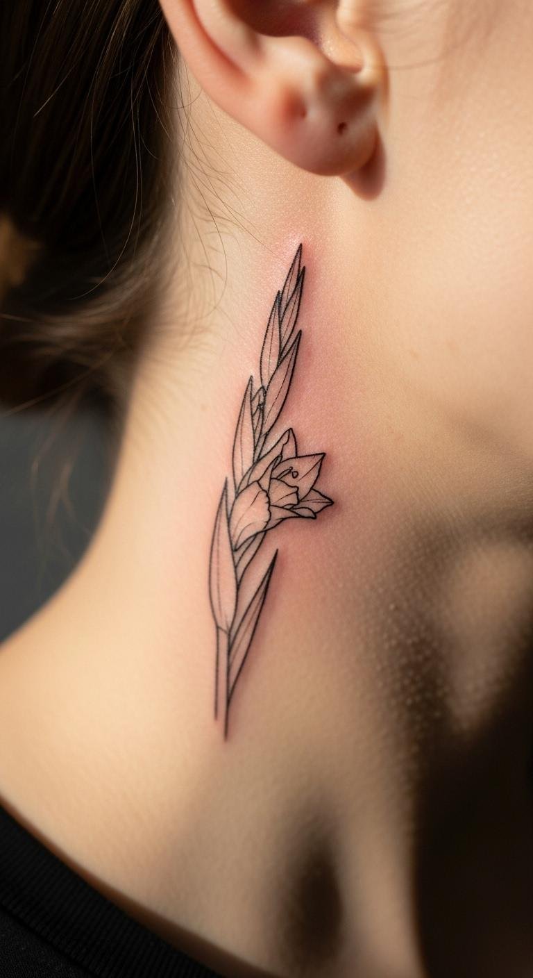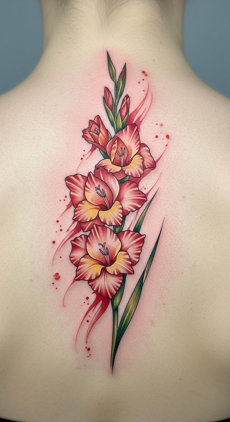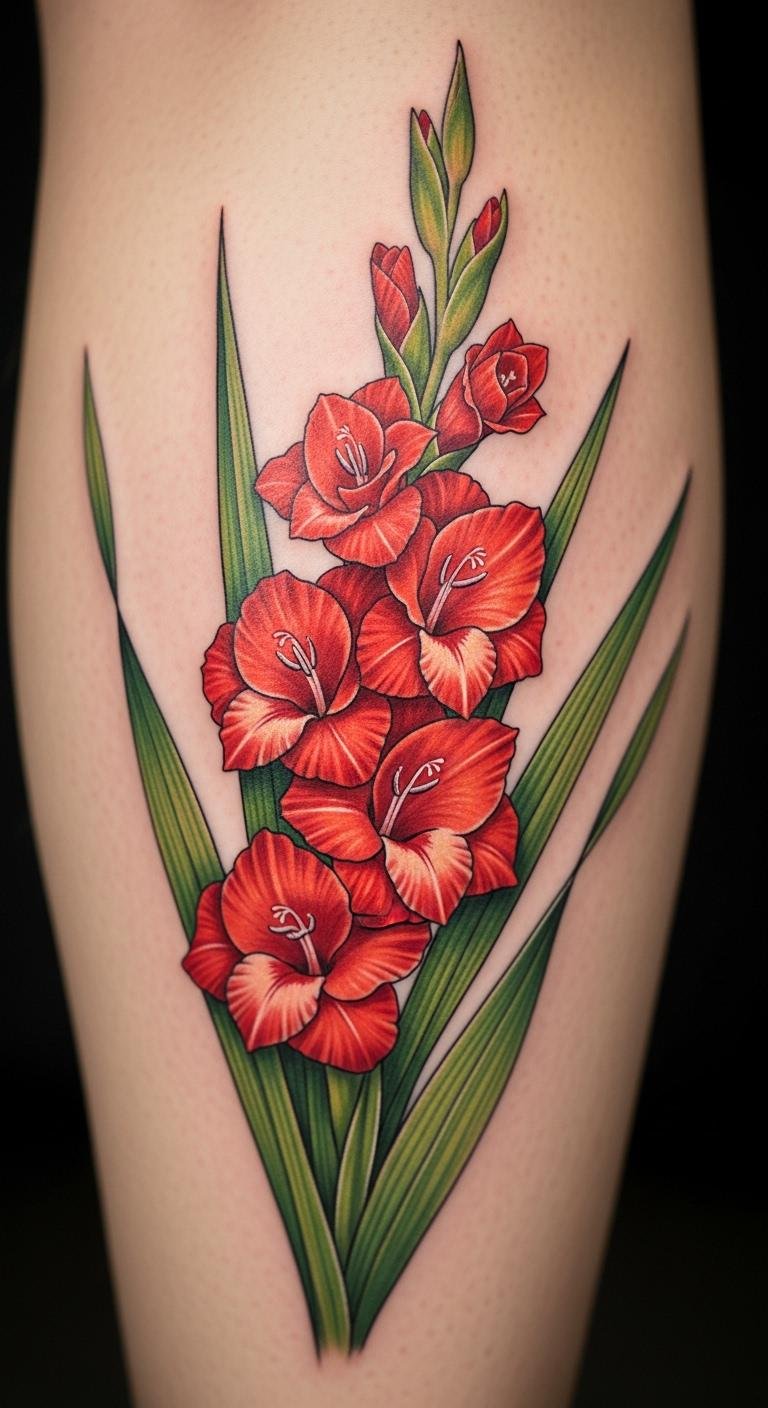 Gladiolus tattoos show power and endurance. Think of a sword-like stem in bold red. This design fits anyone seeking a strong look. Start with a sketch on paper. Use free apps to draw ideas. They help you plan without a tattoo yet. Pick colors that match your skin. Red pops on fair tones. Go to a local artist for advice. Many charge under $100 for small ones. Add a simple vine for extra flair. Try temporary stickers first. They cost $5 online and let you test the feel. Keep it simple for daily wear.