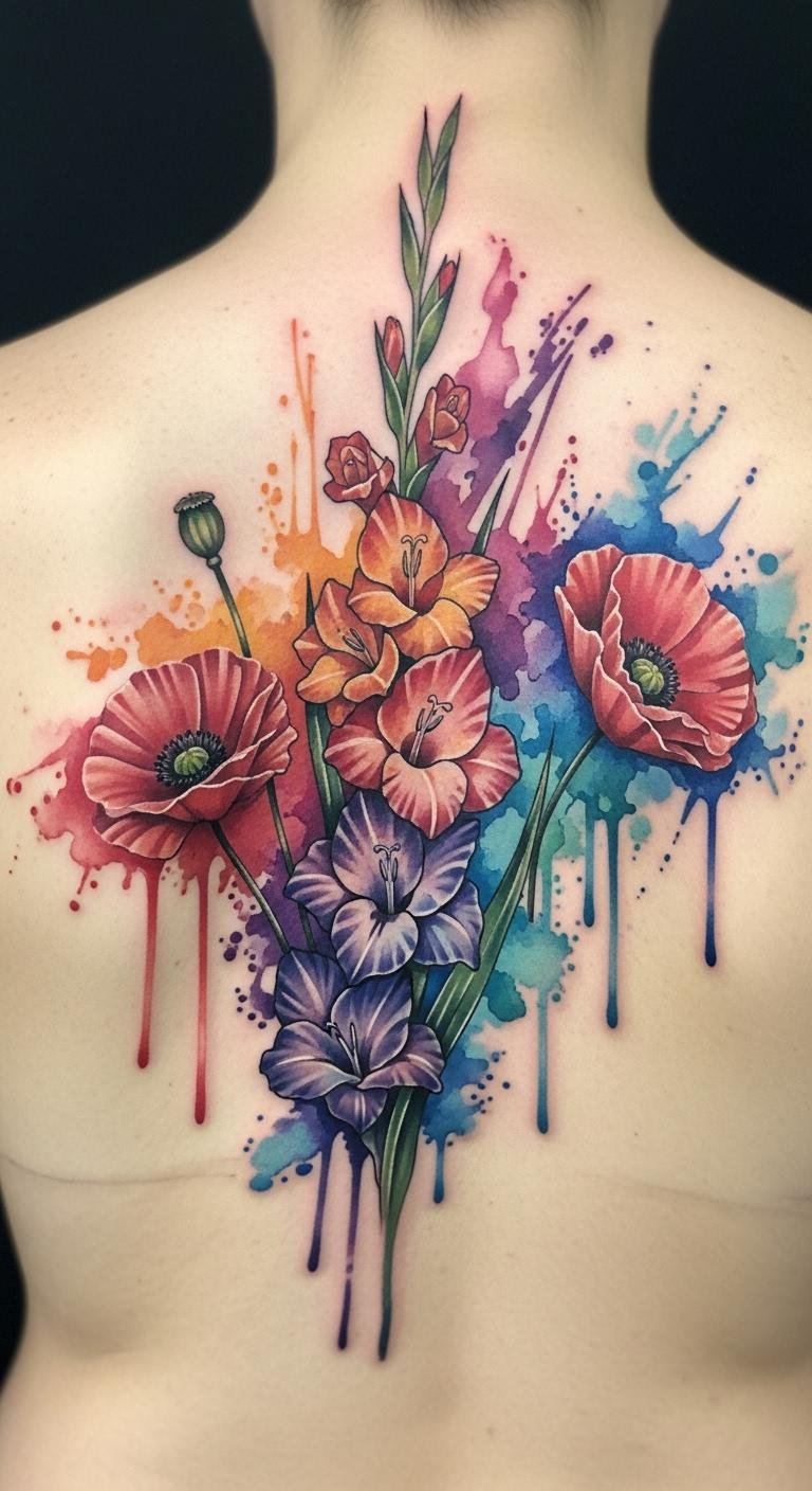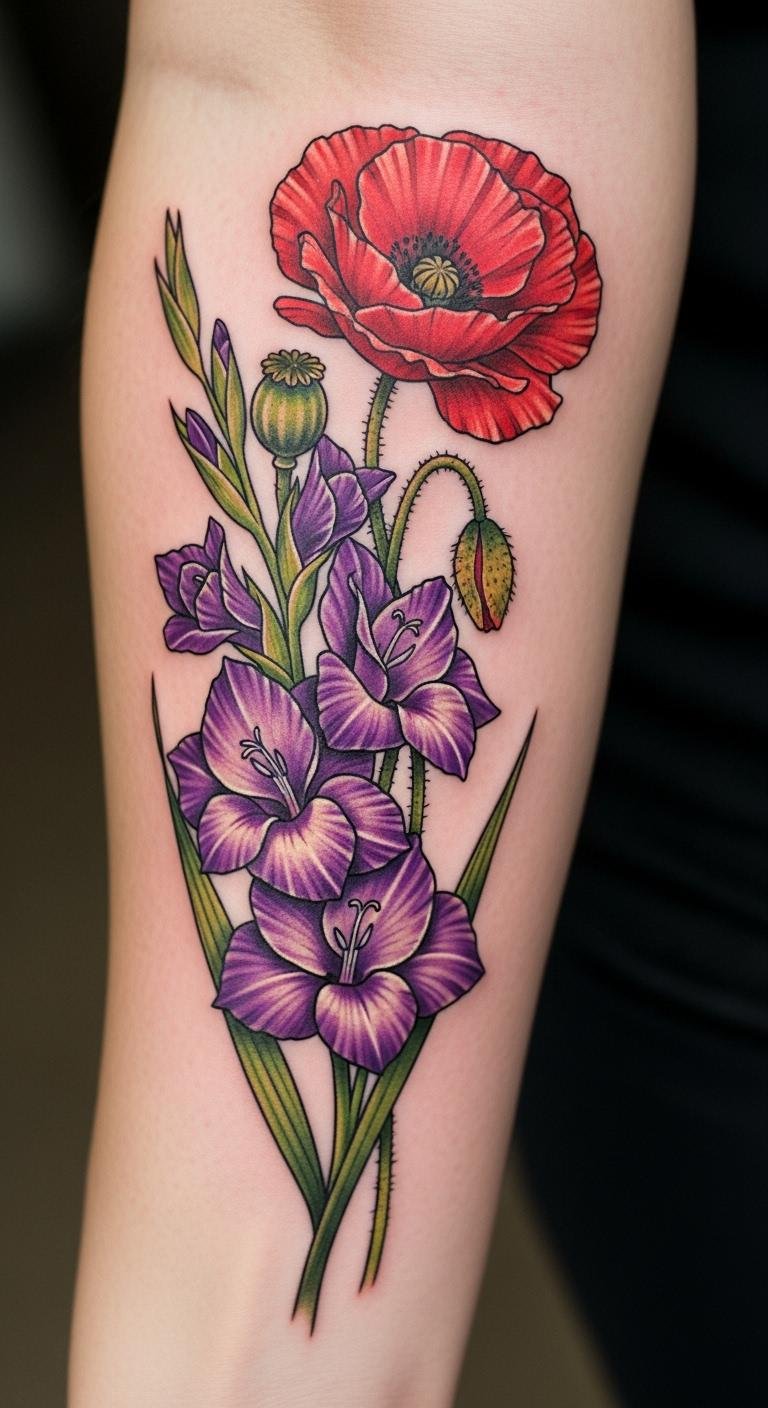 Pair poppy and gladiolus for balance. See them side by side on your forearm. This tells a story. Sketch both quickly. Use free apps. Artists combine for $70.