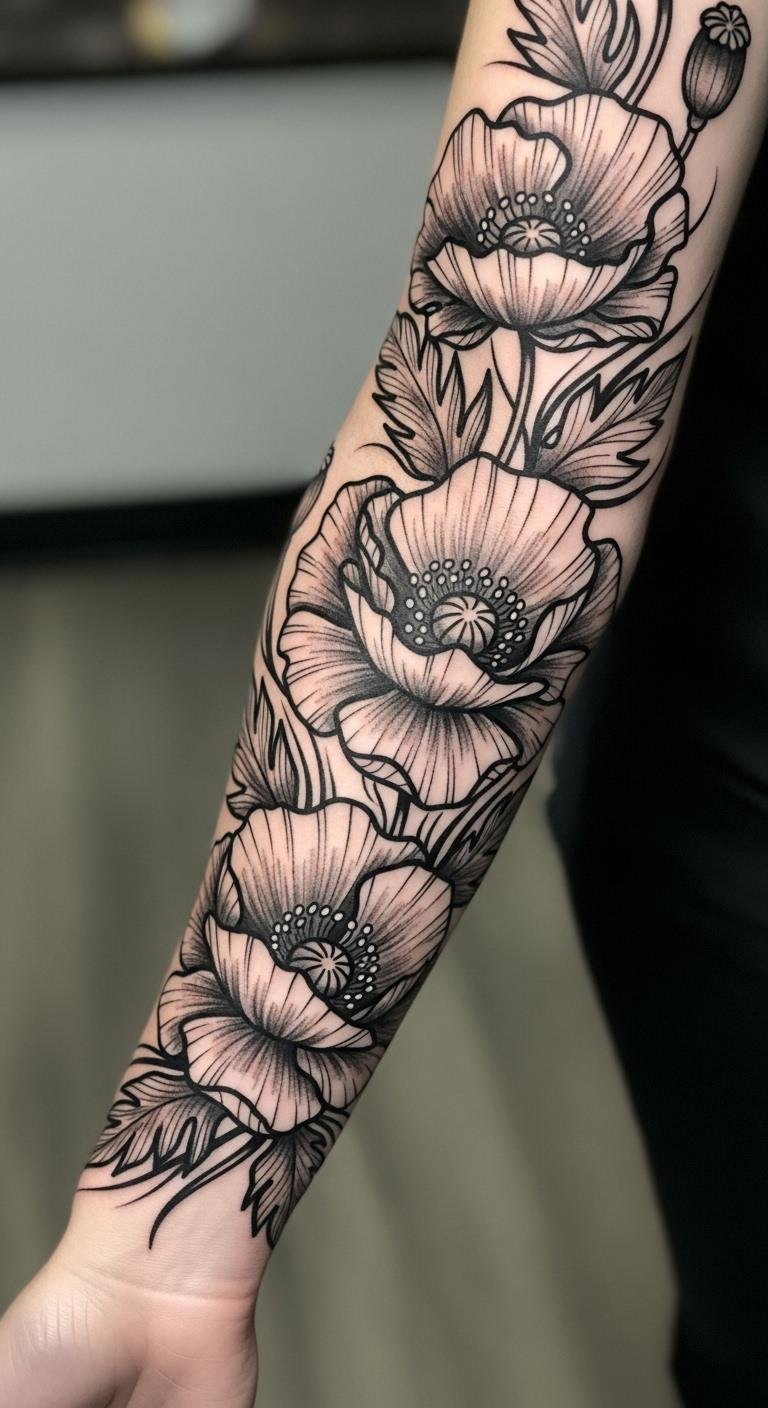A full blackwork poppy covers bold. Envision the whole flower on your arm. This makes an impact. Shade with charcoal paper. Practice at home. Shops fill for $90.