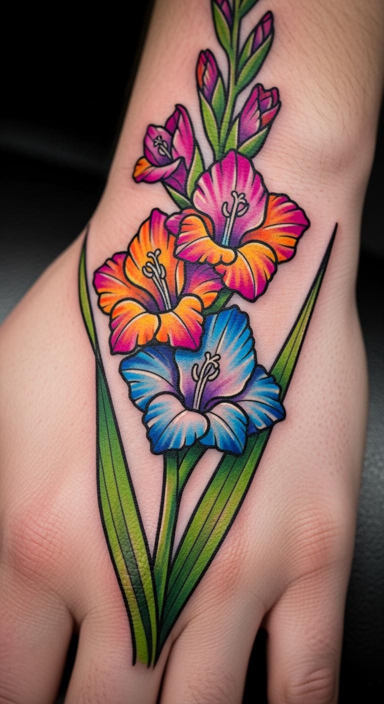 A vibrant gladiolus on your hand pops. Imagine bright yellows and reds. This energizes your look. Color with markers first. Easy at home. Costs around $50 for real.