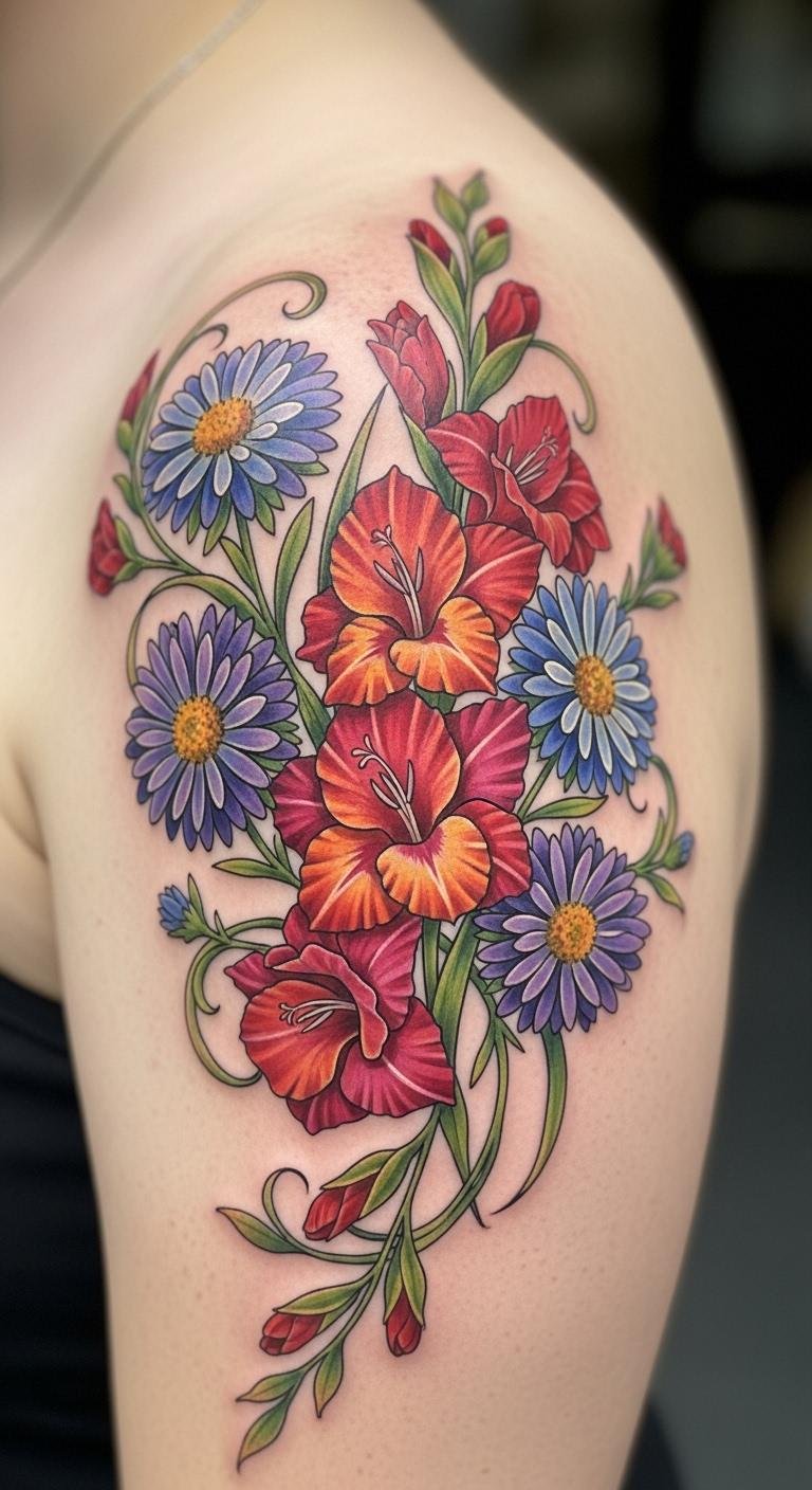 Pair gladiolus with aster for a story. Think tall stems next to purple blooms on your shoulder. This design tells of strength and new starts. Draw both on paper with crayons. Find free templates online. It helps blend ideas quickly. Choose spots with room, like your back. Artists can add this for around $150. Include a vine to connect them. Use sticker sets for $10 to test first.