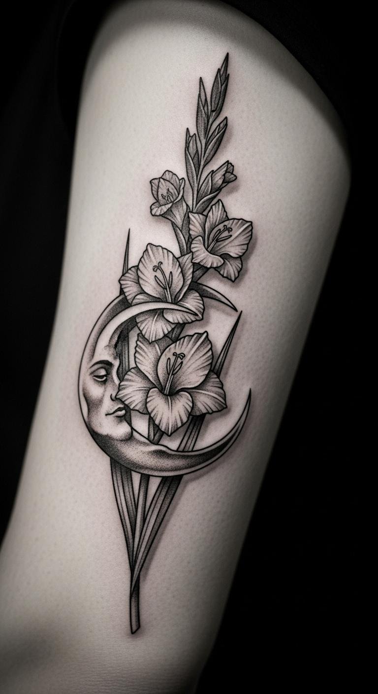 Add a moon to your gladiolus for flair. Picture a yellow bloom next to a crescent on your arm. This mix brings personal vibes. Draw it on paper with a pencil. Free tools online make it simple. Start with your birth date in mind. Artists tweak designs for $20 extra. Place it on visible spots. Try moon stickers for $3 as a trial.