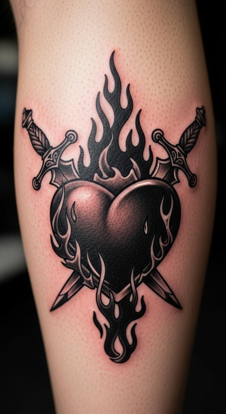 Flames and swords with a black heart mean fierce resolve. Leg offers space. Cost $150. Combine drawings at home. Online freebies for elements. Simplify for savings. Add your touch. Conceal with pants. Fight on with this.
