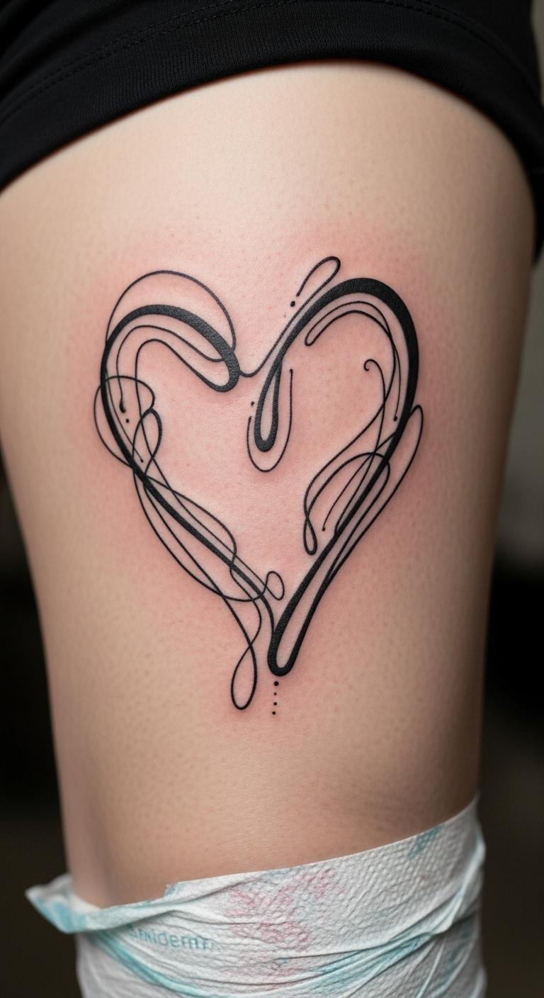 Abstract forms let a black heart flow freely. Thigh provides room. Around $120. Doodle abstracts at home. Digital free tools help. Go with flow. Personalize freely. Cover with clothes. Express your art.