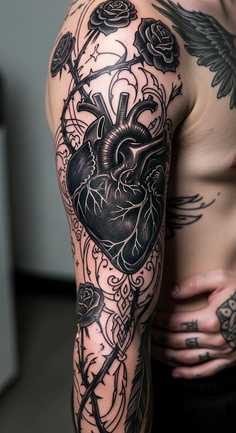 A sleeve of black hearts builds a story. Arm for full display. Cost $200 plus. Plan with sketches at home. Free sleeve ideas online. Start small. Layer personally. Roll sleeves up. Tell your tale.