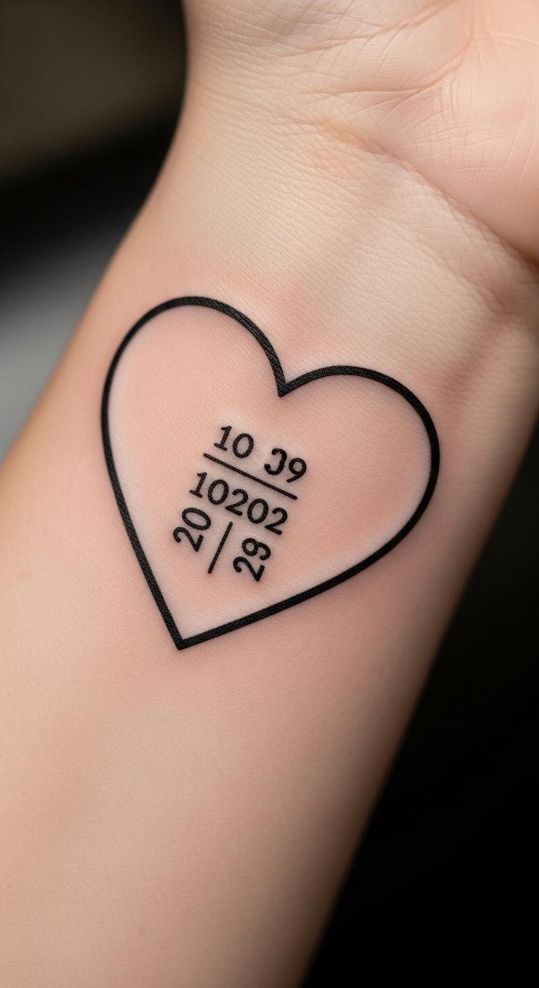 Dates in a black heart honor lost moments. Place on your inner wrist for intimacy. Cost around $90 to $150. Jot dates on paper at home to design it. Free online generators help customize. Use basic fonts to keep costs down. Include names if it fits. Hide under watches. Remember it as a tribute each day.