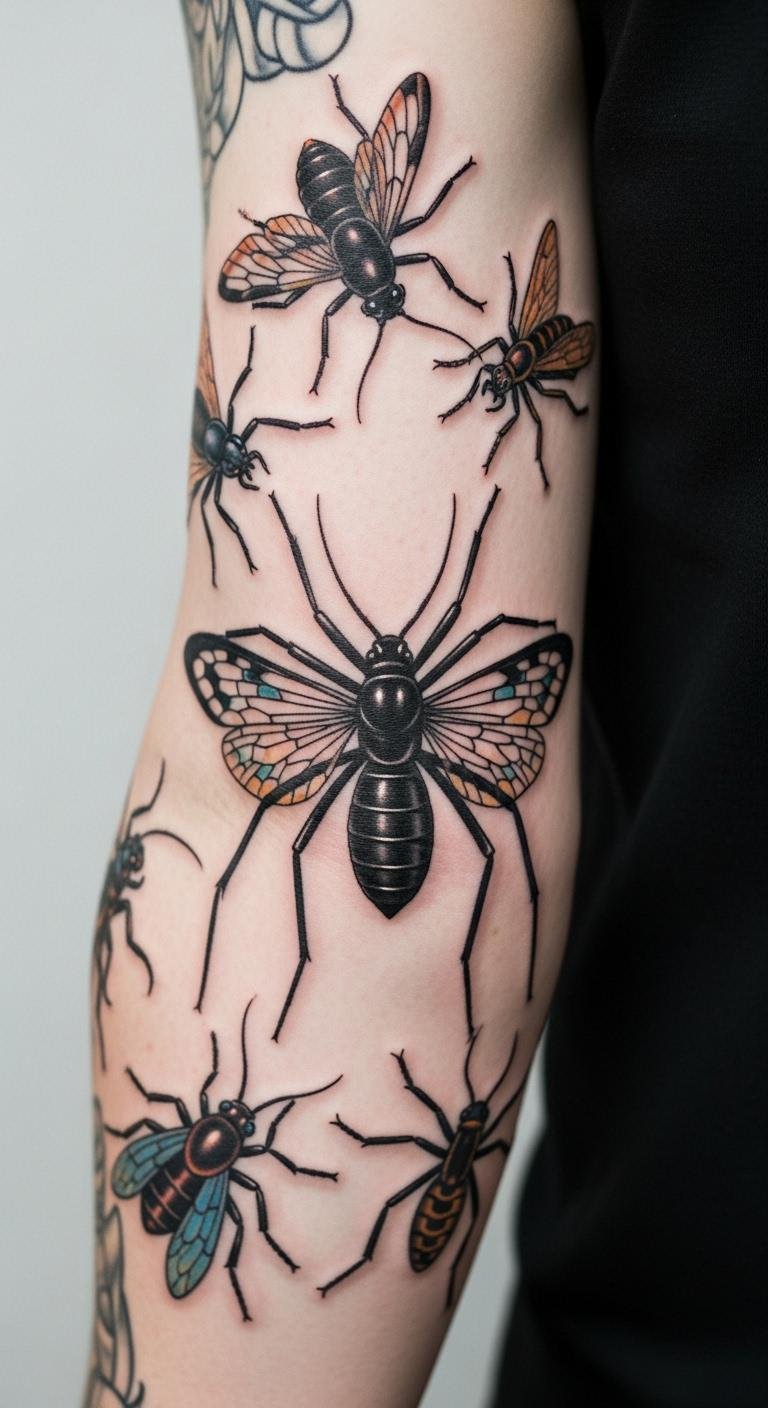 A classic realistic black widow tattoo brings the spider to life on your skin. Picture a detailed design with the spider’s glossy black form and that signature red hourglass.