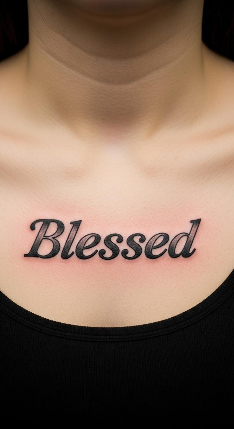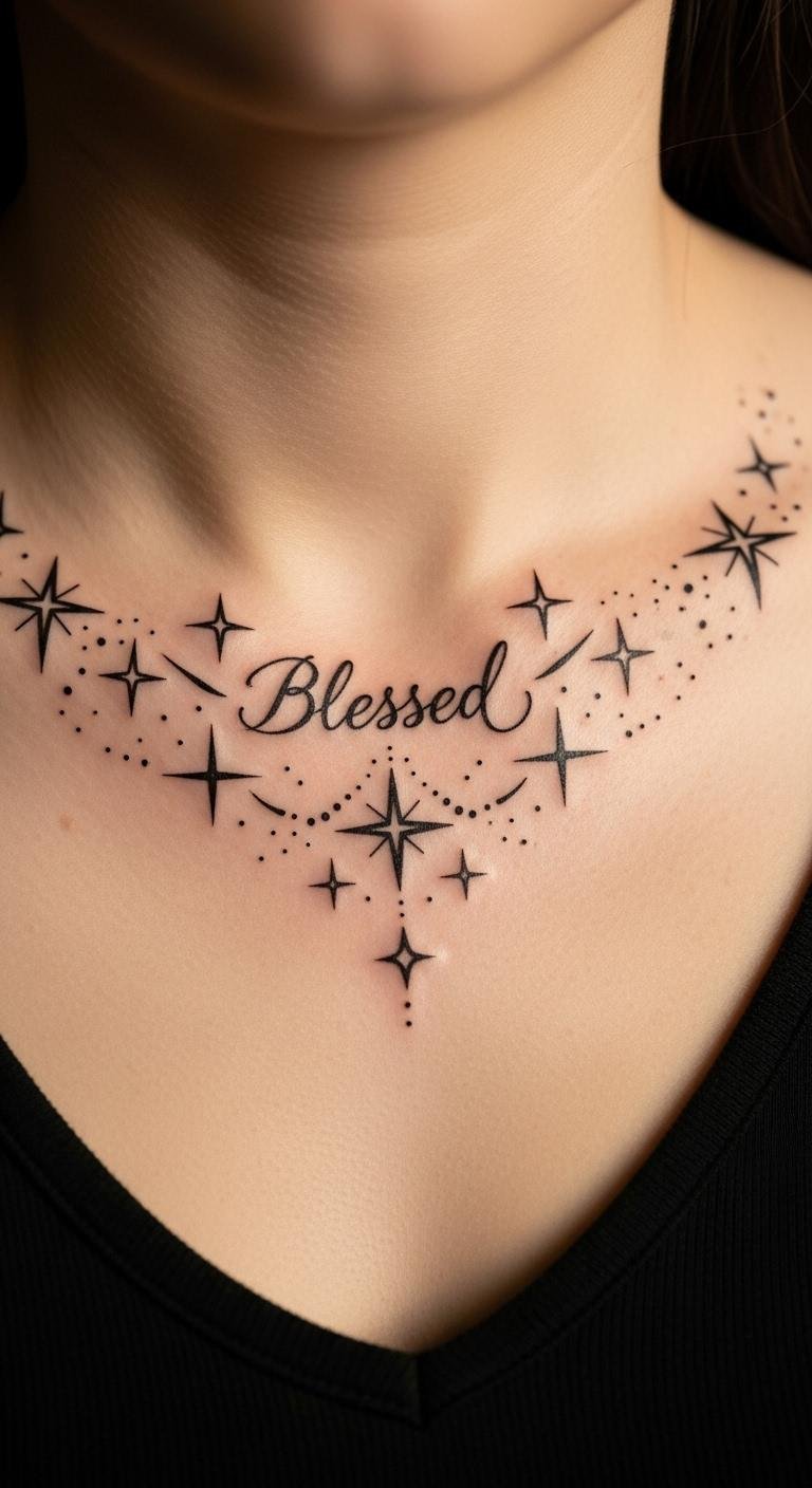 Incorporate stars with “Blessed” on your collarbone. Stars evoke wonder and pair nicely with the word. It’s a celestial nod to guidance. Sketch star patterns on your skin with markers. Find affordable options on community boards for about $70. Choose dotted stars for a soft look. This idea sparks confidence by reminding you of vast possibilities. Use sunscreen to preserve the stars. Try a wash-off version with body paint. Customize the number of stars.