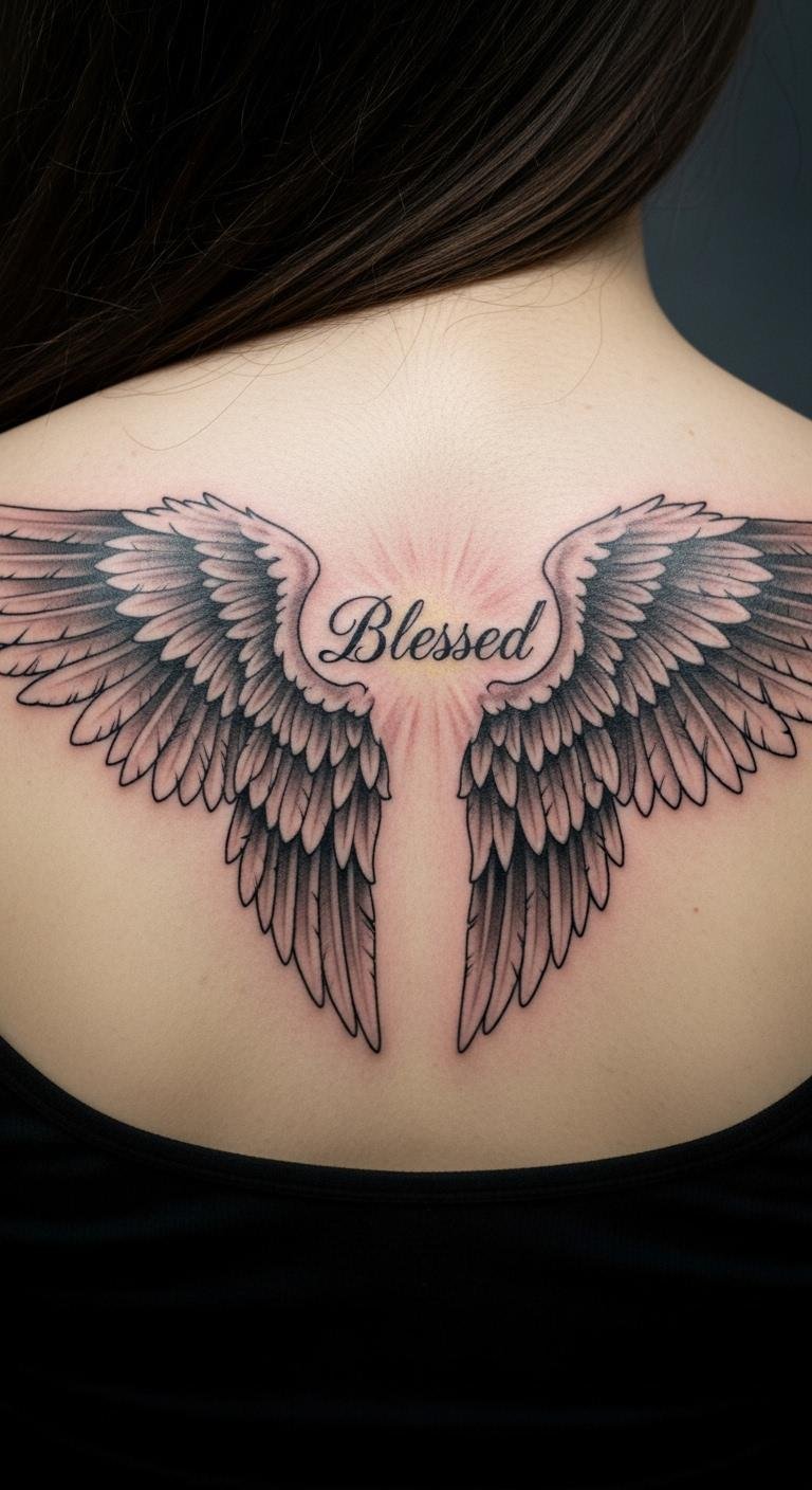 Frame “Blessed” with a halo on your back. Halos signify purity and light. It’s an angelic touch. Circle sketches on paper for ideas. Search for halo specials at $100. Use thin lines for delicacy. This idea sparks confidence as a divine reminder. Use creams for maintenance. Test with halo drawings. Adjust the size.