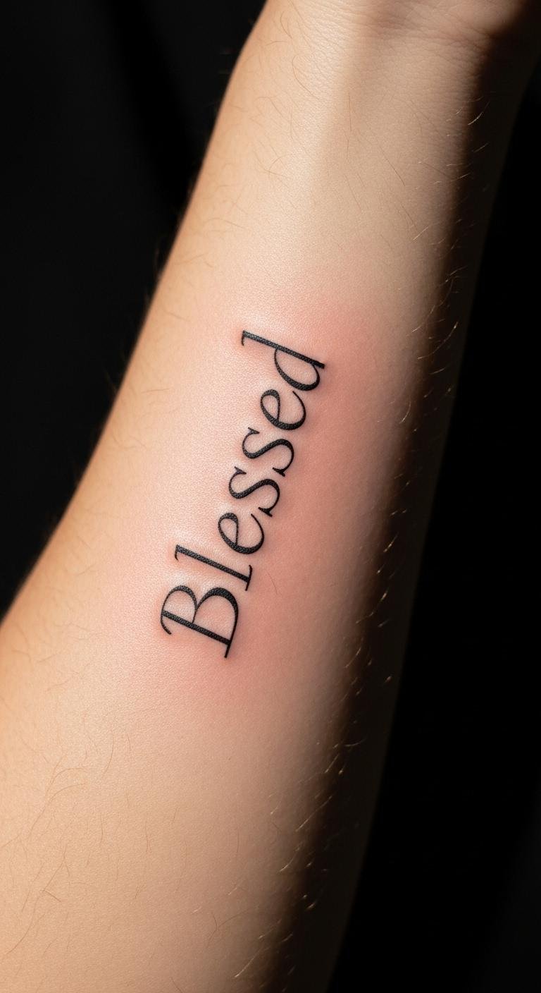 Consider a straightforward “Blessed” script tattoo on your wrist. It’s a subtle choice that shows up just right. Pick a thin font for a modern look. This spot is easy to hide or show off. Start by sketching ideas at home with a pen and paper. Use free online tools to try different fonts. For budget tips, visit a local artist for a small session—many offer deals under $50. Think about placement for daily visibility. It builds confidence by reminding you of good times. Pair it with a simple band-aid after inking to protect it. Try a temporary sticker first to test it out. Keep it personal and meaningful.