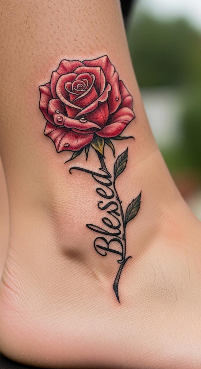 Add a rose to “Blessed” on your ankle. Roses stand for beauty and resilience. This spot keeps it discreet yet personal. Draw roses on paper to plan ahead. Check for budget artists offering sessions around $90. Go for outlined roses to save time. The tattoo fosters confidence by symbolizing strength. Moisturize daily with basic lotions. Experiment with flower stickers as a trial. Tailor the rose size to your liking.