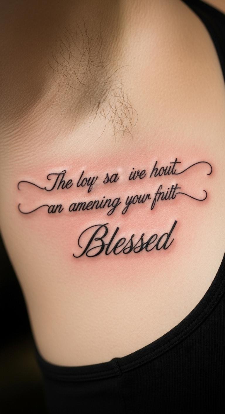 Try “Blessed” in watercolor style on your shoulder blade. It gives a painted, artistic feel. Colors blend softly for a unique look. Experiment with watercolors at home for ideas. Search for watercolor experts online at $80. Pick soft hues for vibrancy. The design boosts confidence with its creative flair. Protect from sun with affordable screens. Use washable paints to preview. Customize the color palette.