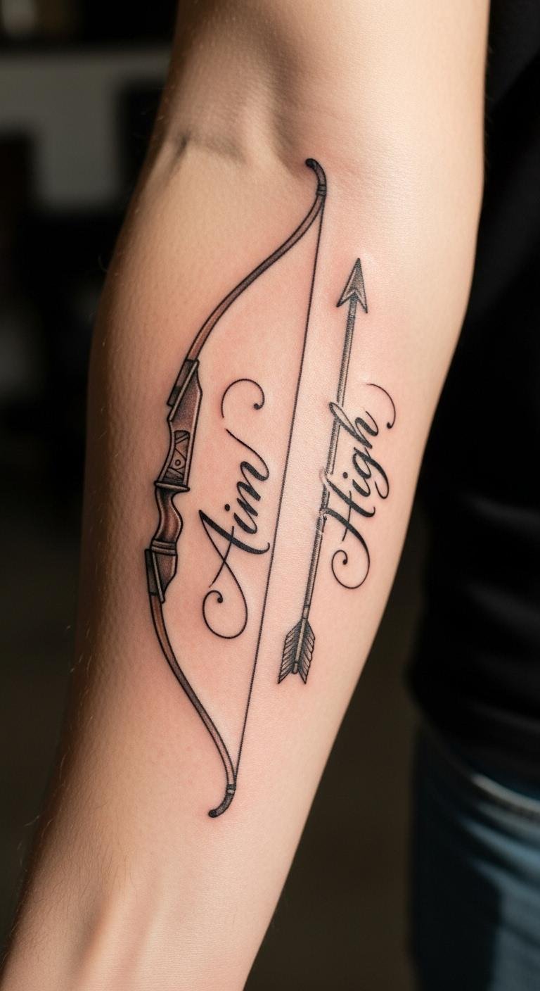 Pair a bow and arrow with a short quote for extra motivation. Words like “Aim High” fit perfectly. Write quotes on paper first with a pen. Free word apps assist. Go for inner forearm to see it daily. Expect $160 for text and design. Pick quotes that match your story. Search artists who handle scripts online. Test with washable markers at home. They cost nothing extra. Use plain fonts to save on complexity. This combo inspires action. Keep it short for impact. Get ideas from books.