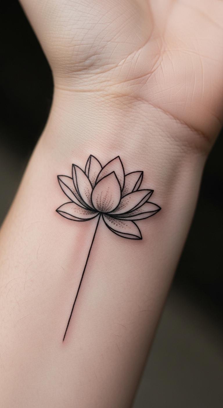 A minimalist lotus tattoo keeps things straightforward and elegant. Picture a small flower on your wrist, symbolizing purity and rebirth. This design fits anyone starting out. Short lines make it quick to ink. Think about drawing a basic shape at home with a marker to test the look. It costs less than bigger tattoos, often under $100 at local shops. Try a temporary version first with stick-on decals from online stores. Place it where you see it daily, like your hand, for a gentle reminder. Bold choices like black ink stand out without overwhelming. Keep sessions short to save money. Artists charge by the hour, so plan ahead. This tattoo adds calm to your routine without fuss.