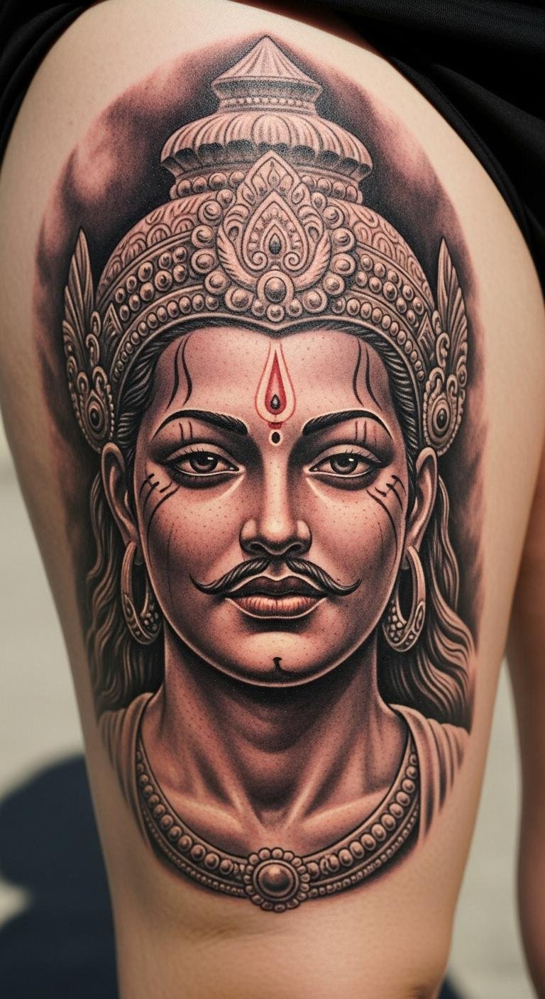 A hyper-realistic deity portrait looks alive on skin. Envision a figure on your thigh with real details. It’s striking yet personal. Draw a face sketch at home. Online resources provide references. Prices around $120. Choose experienced folks. Place it where you like. Use photo edits for previews. This design offers deep meaning. Plan a comfortable session.