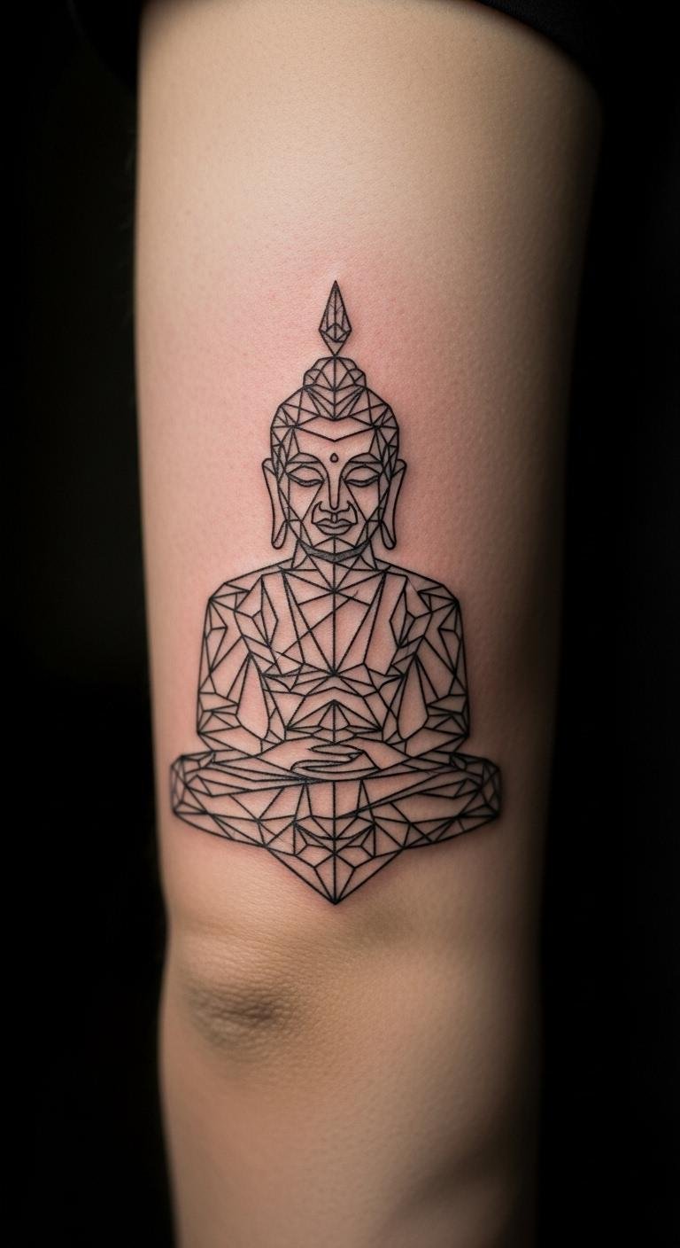 An abstract geometric Buddha tattoo plays with shapes. See modern forms on your elbow. It’s creative and adaptable. Build with blocks at home. Free tools help design. Costs about $60. Find budget options. Put it on display. Test with drawings. This tattoo inspires thought. Make it quick.