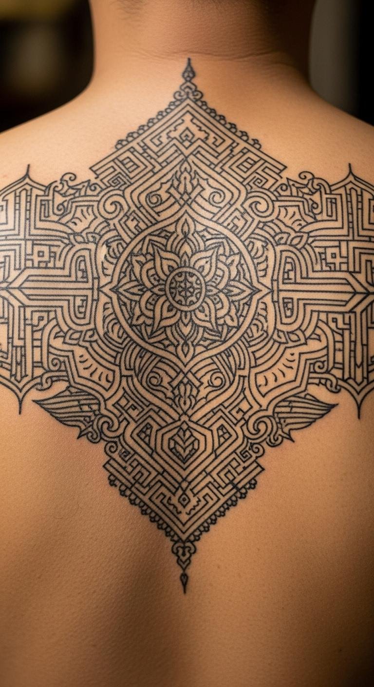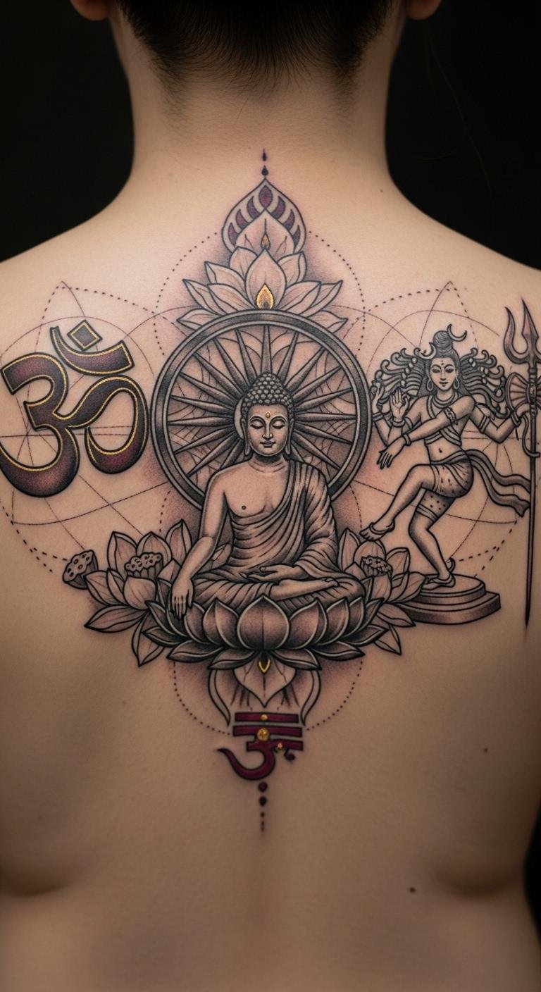A Hindu-Buddhist combined motif blends traditions. Picture elements on your back. It’s inclusive and meaningful. Draw combined ideas at home. Free mixes online. Costs around $90. Look for versatile spots. Place it carefully. Try temporary versions. This design fosters unity. Book accordingly.