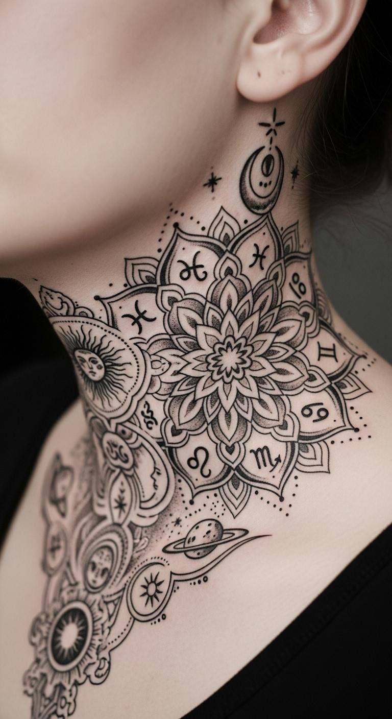 An astrology-infused mandala tattoo combines stars and circles. Picture both on your neck for a cosmic feel. Make it your own. Sketch stars and shapes at home. Free apps assist in mixing. Costs start at $70. Look for creative artists. Position it thoughtfully. Try paper cutouts first. This tattoo brings star-inspired calm. Keep it balanced.