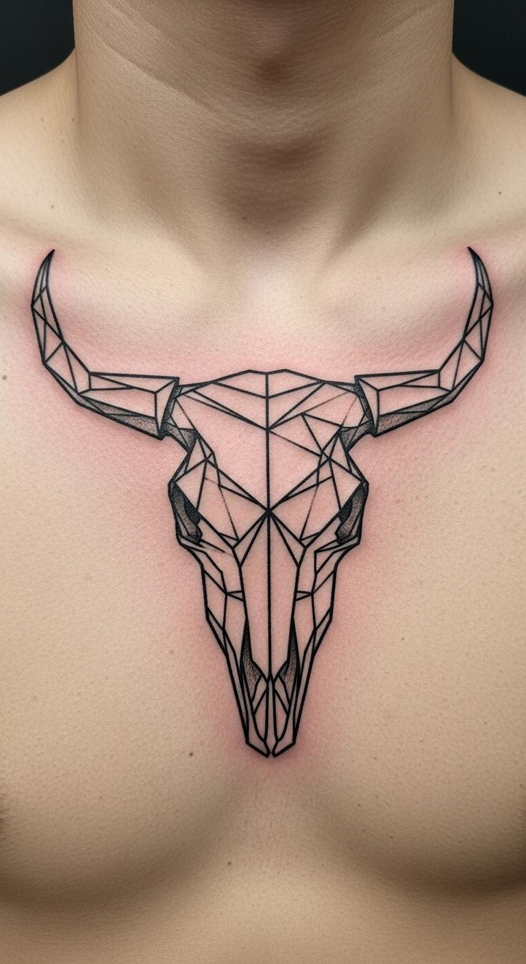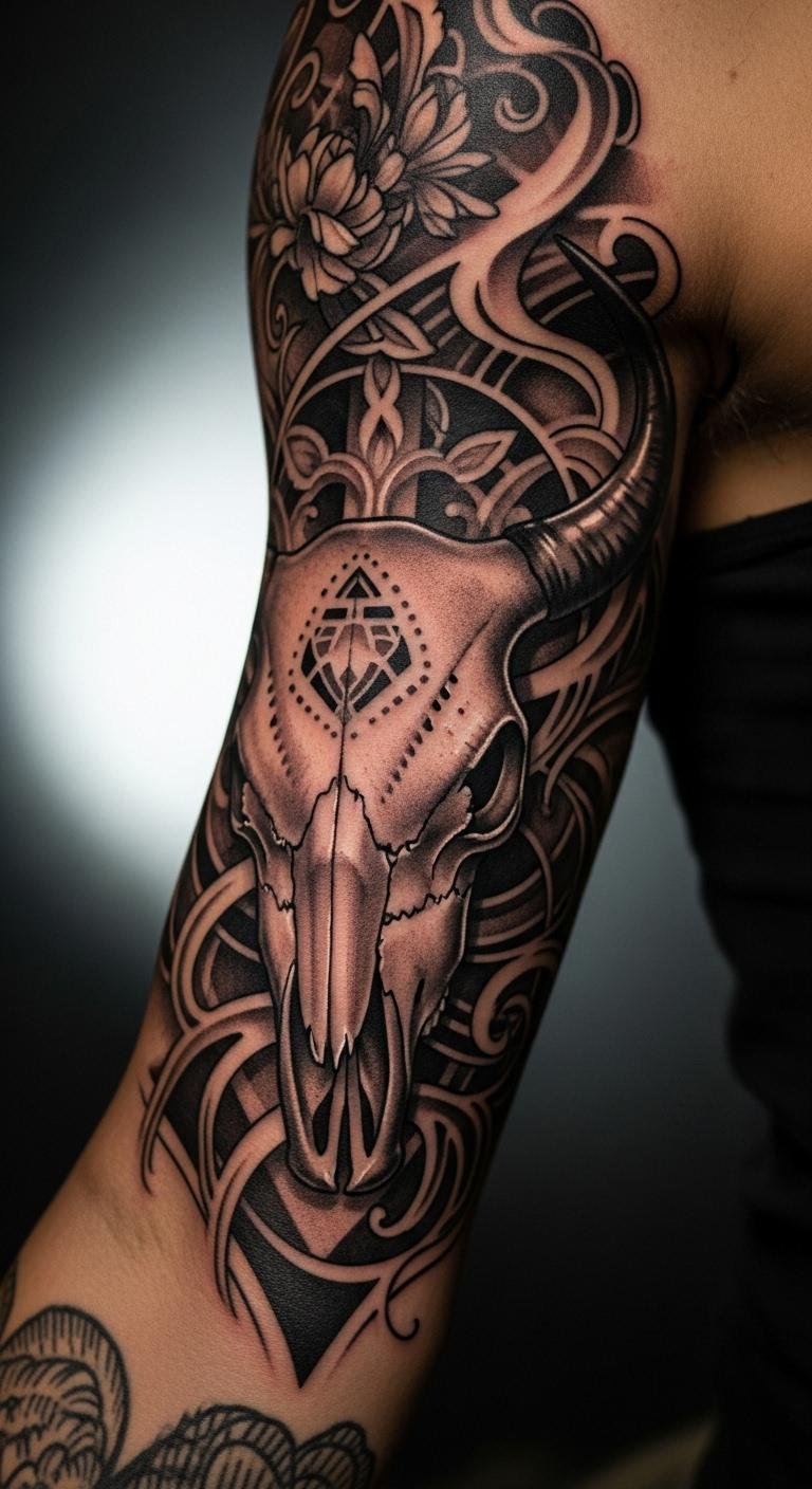 Geometric patterns give your bull skull a modern edge. Use graph paper to plot simple shapes. This design layers triangles around the skull. Build it step by step with a ruler. Place it on your back for a bold statement. Find local pros who specialize in shapes at fair rates. Go with basic outlines to cut costs. Add your angles for a custom feel. Try stencils from online freebies. This keeps things straightforward and fun. You create ink that mixes art with math.