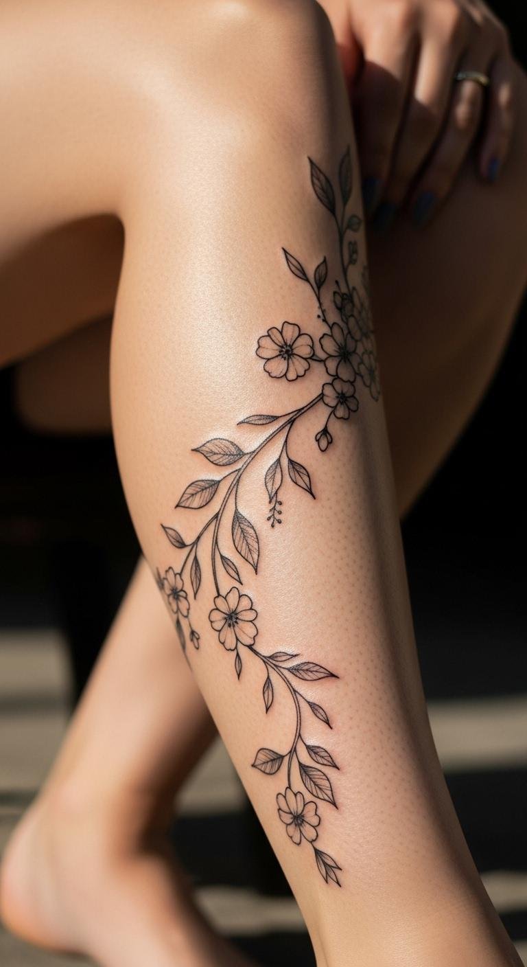 Floral vines wrap around the calf like nature’s hug. Picture soft roses climbing up your leg. This design adds a touch of grace without overwhelming your look. Start small with a single vine using temporary tattoos from online stores for under $10. Try drawing it on with henna at home to test the feel. Bold the key: floral vines stand out for their elegance. Pick a local artist who specializes in fine lines; sessions often cost $50–$100 for basics. Mix in colors with water-based markers for a DIY preview. Keep it simple by choosing spots that hide under pants for work. This tattoo boosts your daily confidence with minimal effort. Go for eco-friendly inks if you’re budget-conscious. Practice sketching vines on paper first. End up with a design that flows with your body’s shape. It’s easy to maintain with regular moisturizing. Select themes that match your story, like growth symbols. You’ll love how it pairs with outfits. Aim for a size that fits your lifestyle. Add personal twists, such as adding a favorite flower. This approach keeps things affordable and fun.