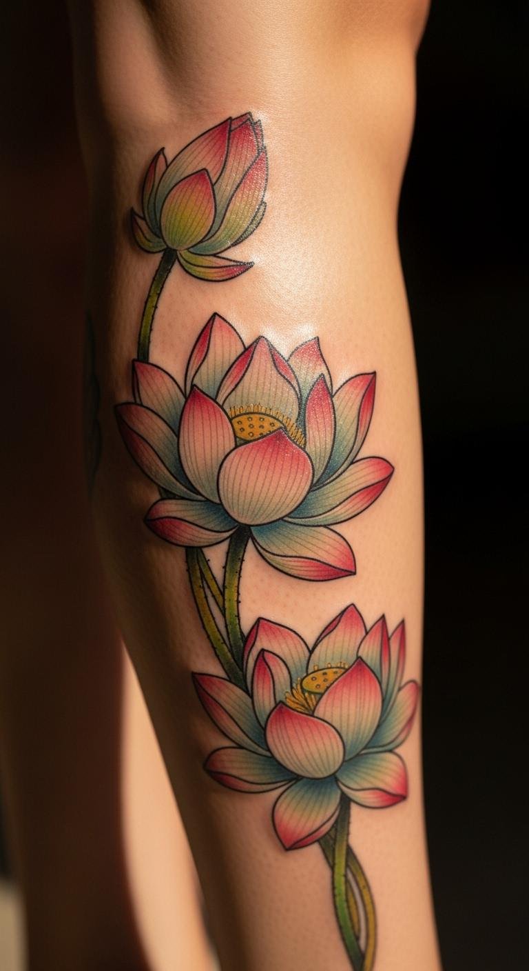 Lotus blooms flower on your calf with serene petals. Picture lotuses rising gracefully. This design promotes peace simply. Try with flower stamps for cheap. Draw blooms on paper. Bold lotus blooms for their calm. Get for $50–$90. Experiment at home. Position thoughtfully. Lotuses mean purity, inspiring daily. Maintain easily. Choose modest sizes. Personalize with shades. This stays affordable and tranquil.