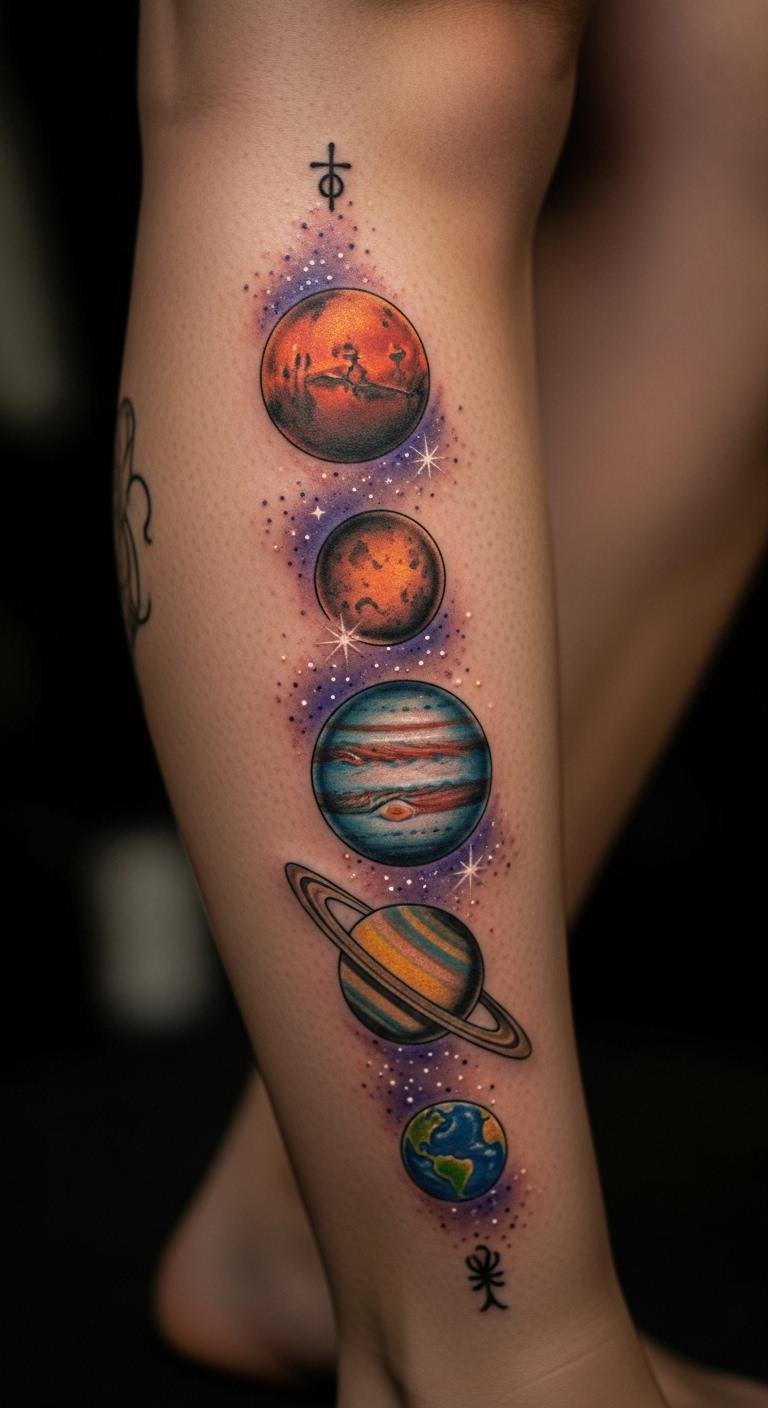 Planet alignments orbit your calf with cosmic dots. Think of solar systems in line. This design explores space simply. Start with planet stickers. Draw alignments at home. Highlight planet alignments for their wonder. Get for $70–$110. Test with circles. Place for awe. Planets mean exploration, sparking curiosity. Care with protection. Select aligned designs. Personalize orbits. This is accessible and starry.