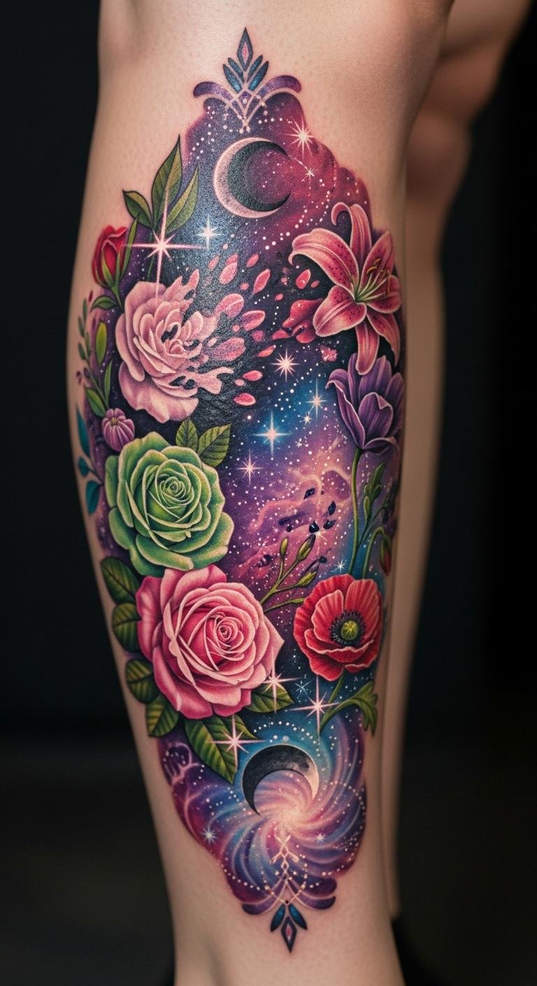 Floral and celestial combine on your calf with mixed elements. Envision stars among blooms. This design blends worlds affordably. Use mixed stickers for tests. Sketch combinations at home. Bold combined designs for their unity. Book at $60–$100. Experiment with both. Position balanced. They mean harmony, creating balance. Care with ease. Choose simple mixes. Personalize elements. This is creative and cohesive.