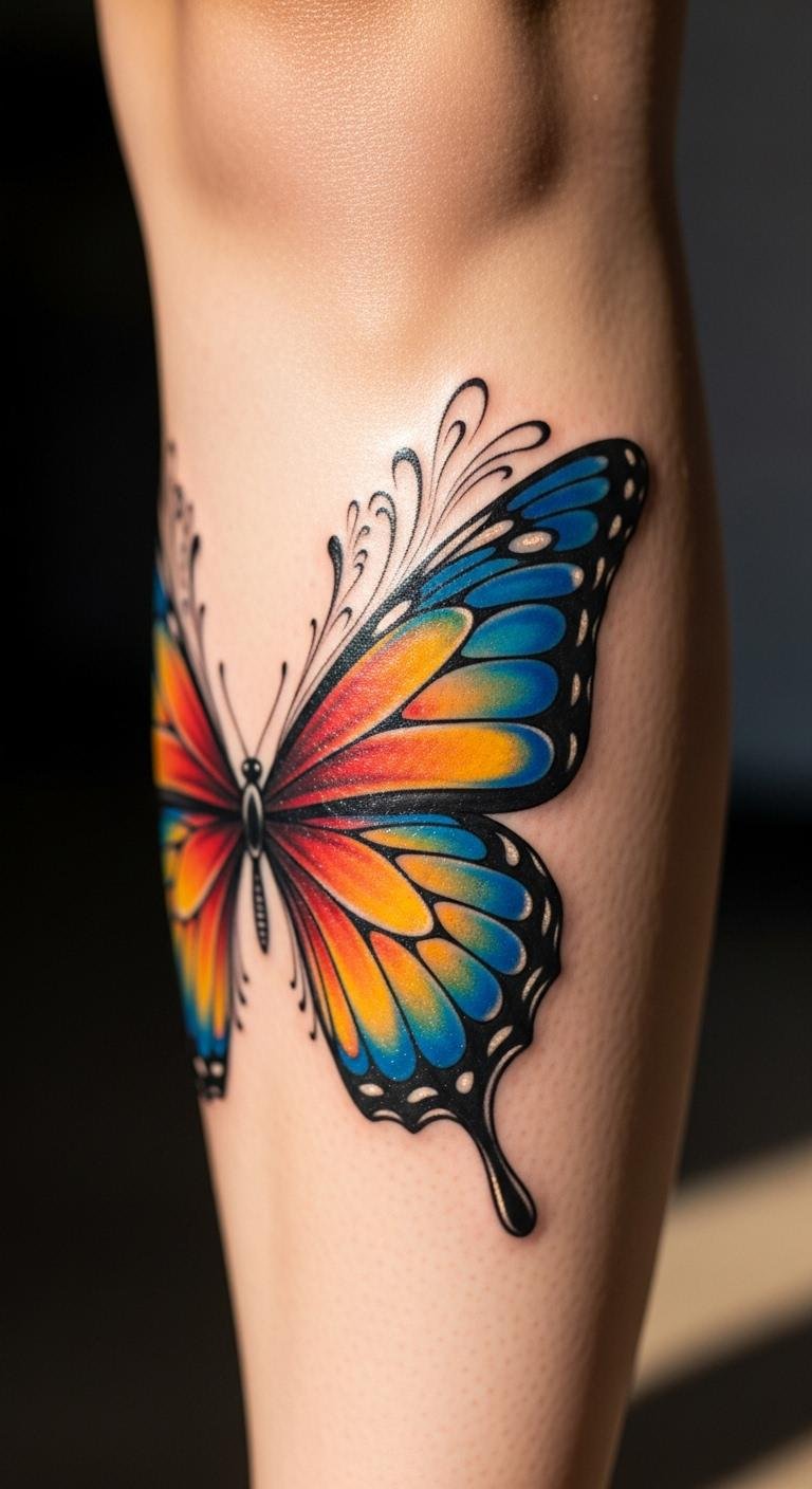 Butterfly wings flutter elegance on your calf with light strokes. Envision wings taking flight on your leg. This design symbolizes transformation simply. Try with butterfly decals for $3 or less. Sketch wings using everyday markers at home. Bold butterfly wings for their free spirit. Schedule affordable appointments for $50–$90. Experiment with fabric paints on fabric for a mock-up. Hide them under dresses for work. Butterflies mean change, ideal for personal growth. Maintain with basic oils. Pick compact designs to cut costs. Personalize with favorite colors. This keeps things practical and inspiring.