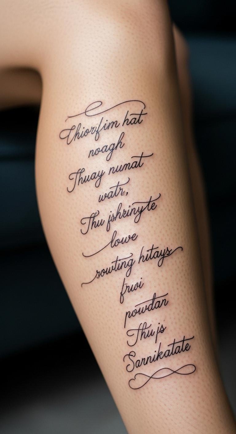 Script mantras flow elegantly on your calf with curved letters. Picture a guiding word. This design empowers with words. Try with script fonts online. Write at home. Emphasize script mantras for their impact. Get for $60–$100. Test with pens. Place for inspiration. Mantras mean focus, guiding paths. Use simple care. Opt for short ones. Personalize phrases. This is practical and motivating.