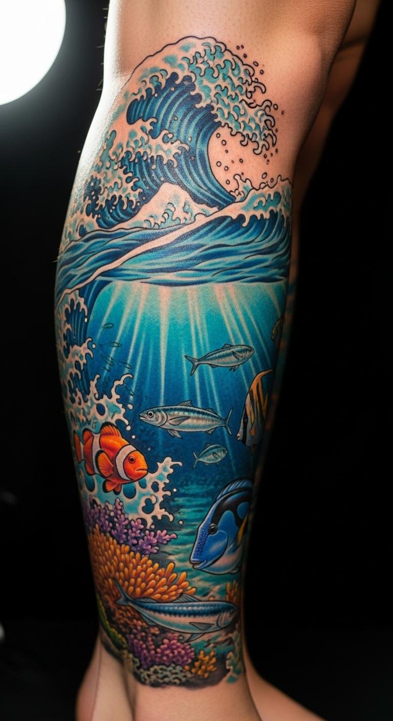 Ocean scenes bring realism to your calf with detailed waves. Envision sea life swimming vividly. This design captures adventure affordably. Use ocean decals for under $4. Draw scenes on paper first. Bold ocean scenes for their lifelike feel. Find artists at $100–$140. Test with paints at home. Hide under clothing as needed. Oceans represent freedom, enhancing confidence. Care with sunscreens. Select focused designs for savings. Personalize with favorite elements. This keeps it accessible and exciting.