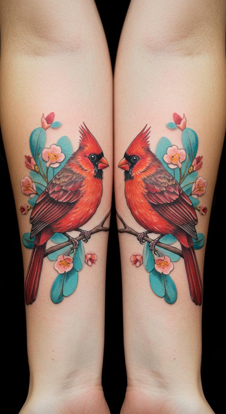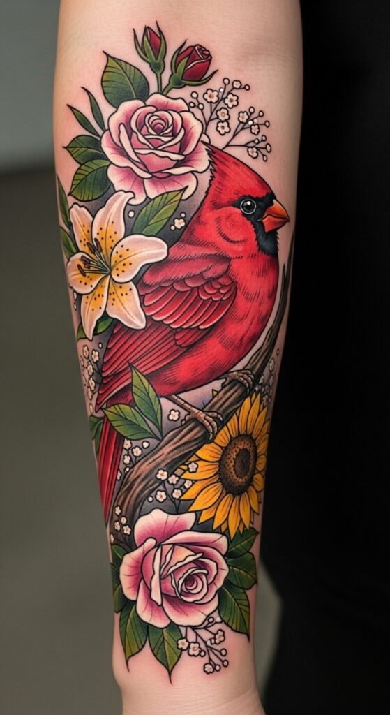 Blend a cardinal with flowers for a nature touch. This mix adds softness to the bird. Practice drawing petals on scrap paper. Search free sites for flower templates. Pick artists offering bundle rates. Go with basic colors to save. Put it on your forearm for visibility. Customize with your favorite bloom. It’s ideal for garden lovers. Use temporary stickers to experiment. Keep designs balanced and fresh.