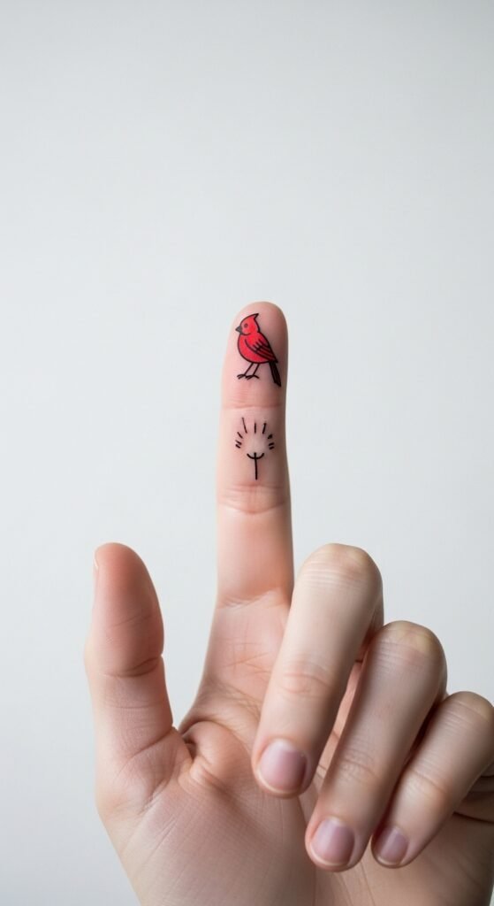Tiny cardinals on the finger are quick and cute. Fit for rings. Draw micro versions. Use finger tracing tools. Go for tiny ink jobs. Keep it one color. Wear gloves over it. Add a beak detail. Great for subtle folks. Test with nail art. Focus on precision.