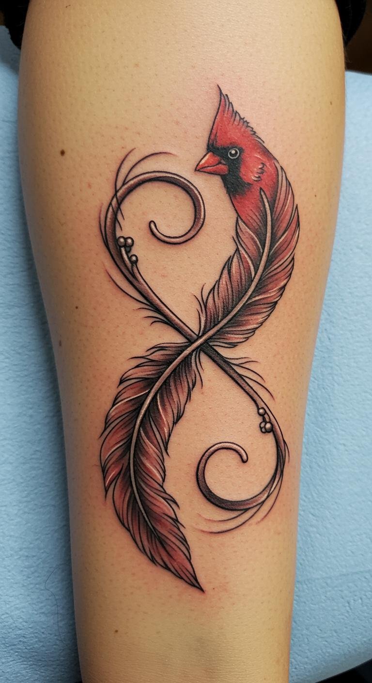 Pair a cardinal with an infinity symbol for a tribute to lost ones. This combo tells a story of endless love. Draw it out at home using a pen and paper. Find free design apps to mix elements easily. Choose a nearby shop with payment plans to keep costs low. Opt for black ink only to cut expenses. Place it on your arm for easy cover-up. Add personal dates if you want. This idea works for small budgets. Test with henna for a trial run. It offers comfort without overwhelming size.
