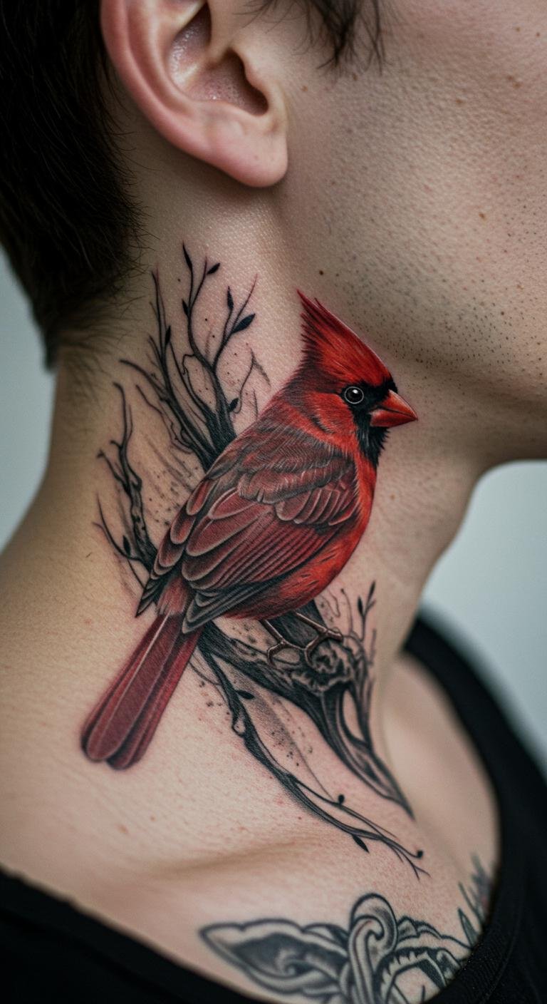 Spiritual cardinals act as messengers on your neck. They bring inner peace. Practice with spiritual sketches. Use online lore for inspiration. Find budget studios for symbols. Limit to key features. Hide under collars. Mix in stars for magic. Great for believers. Try with symbolic drawings. Make it profound yet simple.