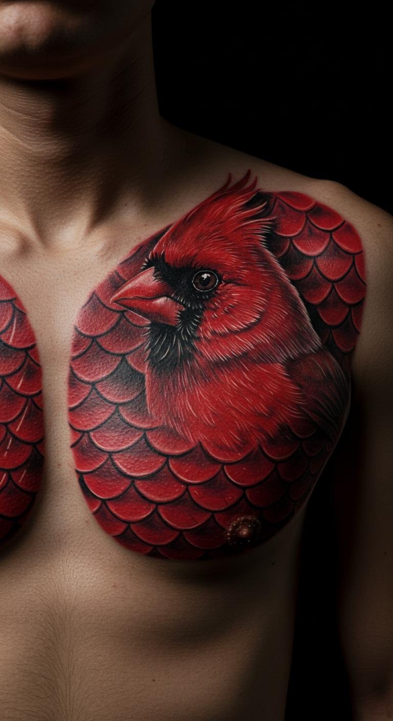 Go bold with a cardinal on your chest. This makes a statement. Outline large ideas at home. Watch chest tattoo videos. Seek deals for bigger work. Use vibrant but economical inks. Show it off or cover up. Add flames for power. Perfect for the brave. Test with large stencils. Focus on impact.