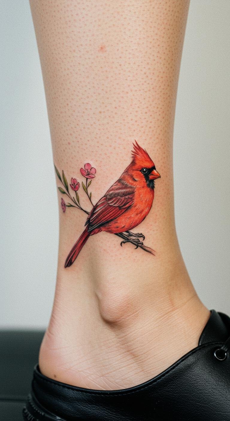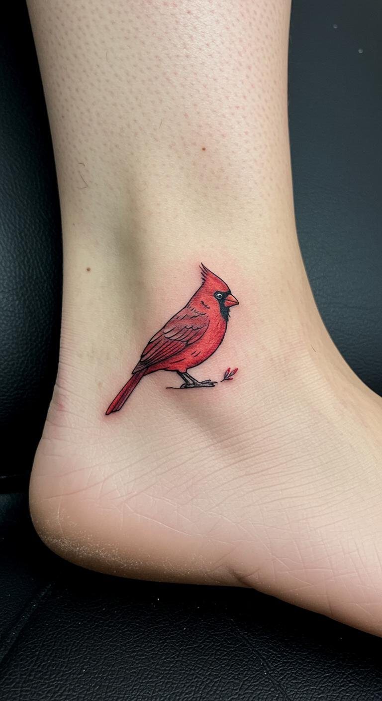 Go small with a cardinal on the ankle for subtle vibes. It fits under clothes yet shows when you choose. Sketch quick ideas on your phone. Use household items like eyeliner for practice drawings. Look for artists who do mini sessions for less than $50. Stick to one color for simplicity. This spot is easy to hide at events. Add a tiny flower for flair. It’s perfect for first-timers. Try stick-on tattoos to preview. Keep it meaningful without extra fuss.