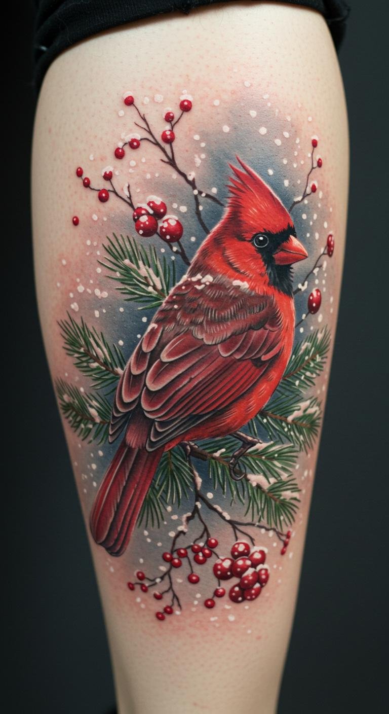 Winter cardinals on the calf bring holiday spirit. Snow adds festivity. Draw snowflakes around it. Find seasonal templates online. Look for winter promo rates. Stick to cool colors. Wear with boots easily. Add berries for cheer. Fun for the holidays. Try with seasonal stickers. Make it warm and inviting.
