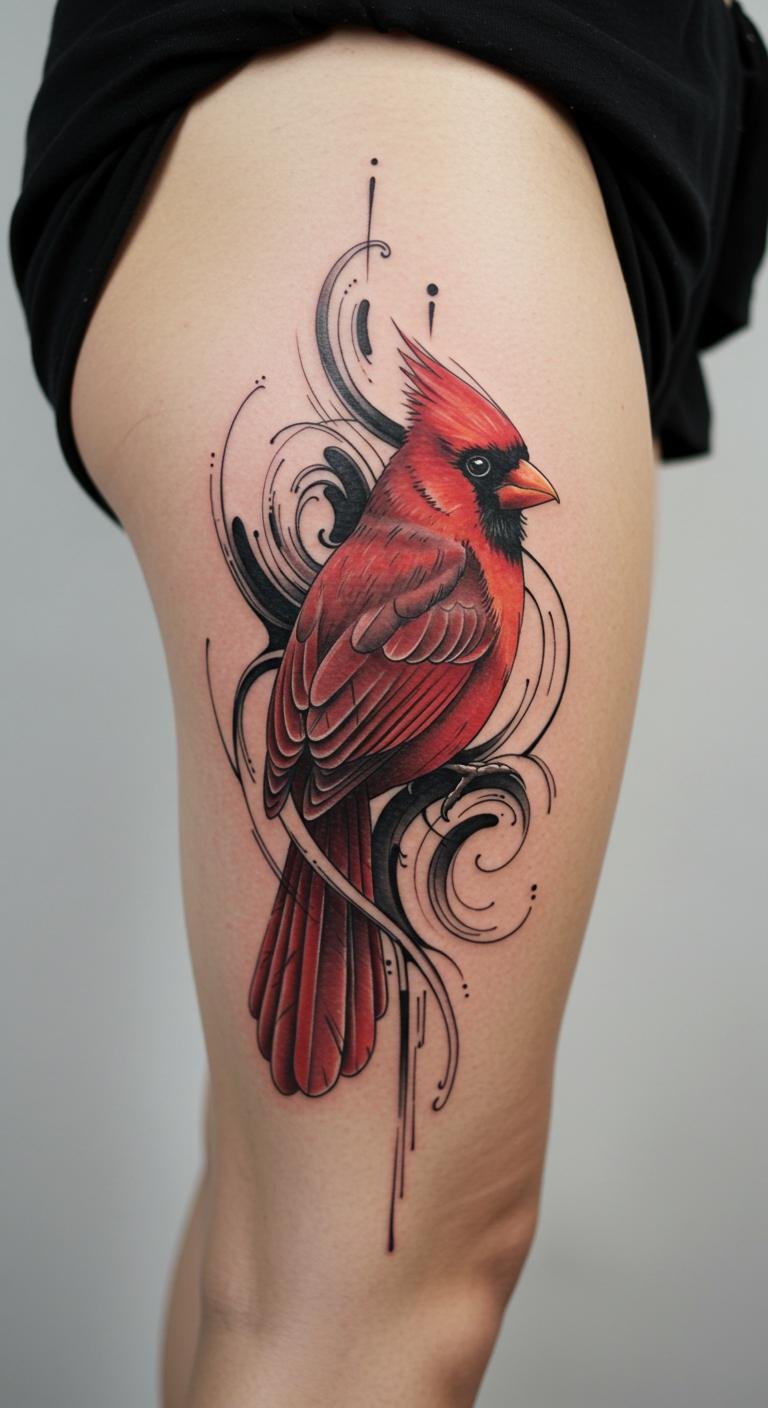 Abstract cardinals on the thigh offer art vibes. Shapes create wonder. Experiment with abstract drawings. Grab free art apps. Find deals for creative work. Use mixed styles cheaply. Cover with pants. Add swirls for flow. Great for artists. Try with abstract paints. Keep it imaginative.