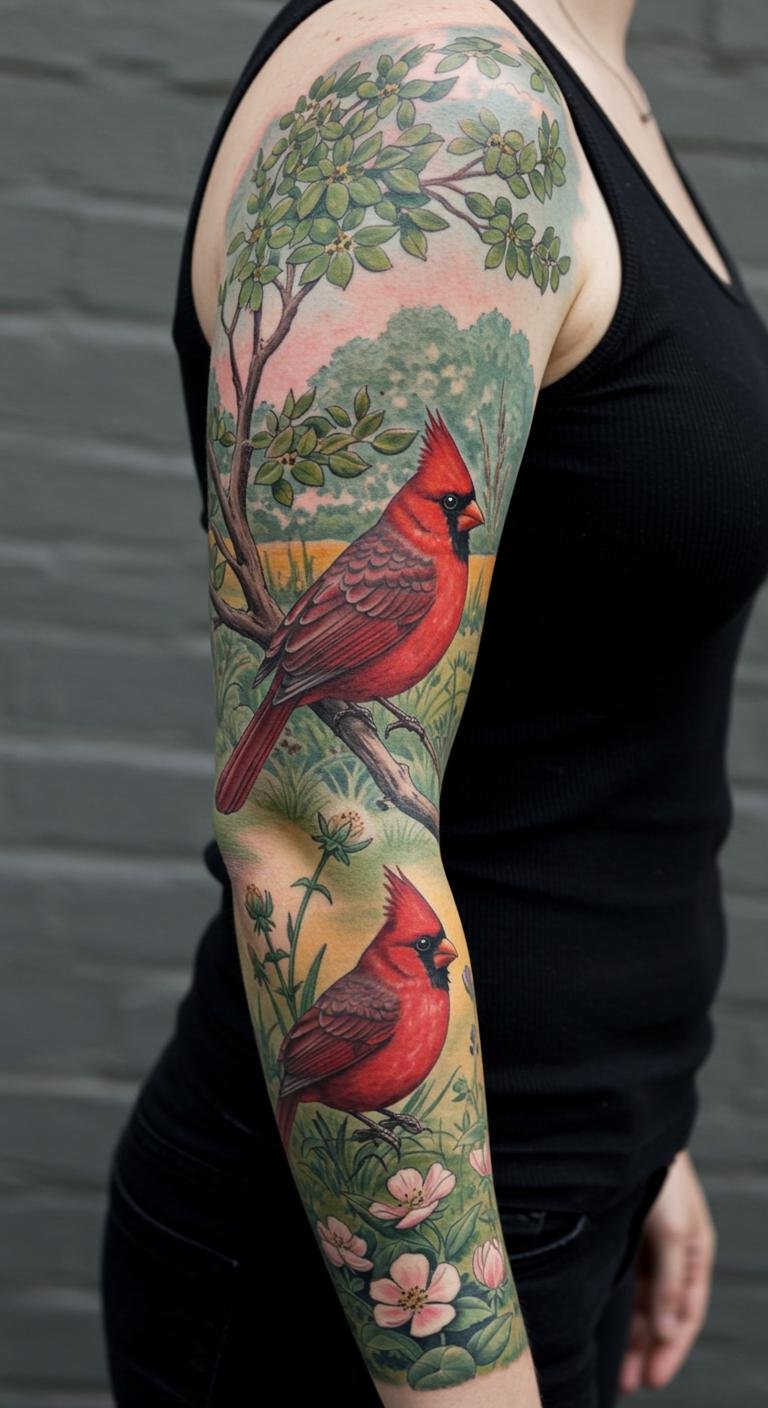 Full sleeve scenes with cardinals create epics. Build a story on your arm. Plan sections at home. Find sleeve ideas online. Break into phases for cost. Use theme colors. Roll up sleeves to display. Add trees for scene. Bold for enthusiasts. Try with arm wraps. Make it epic.